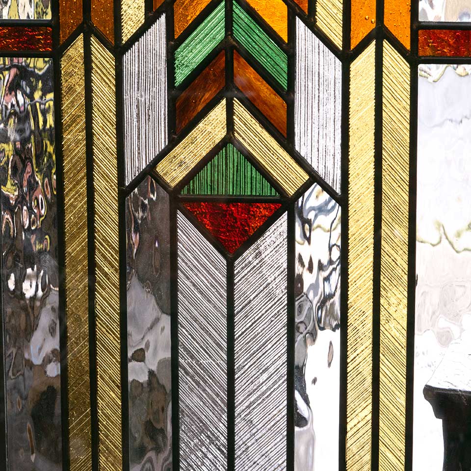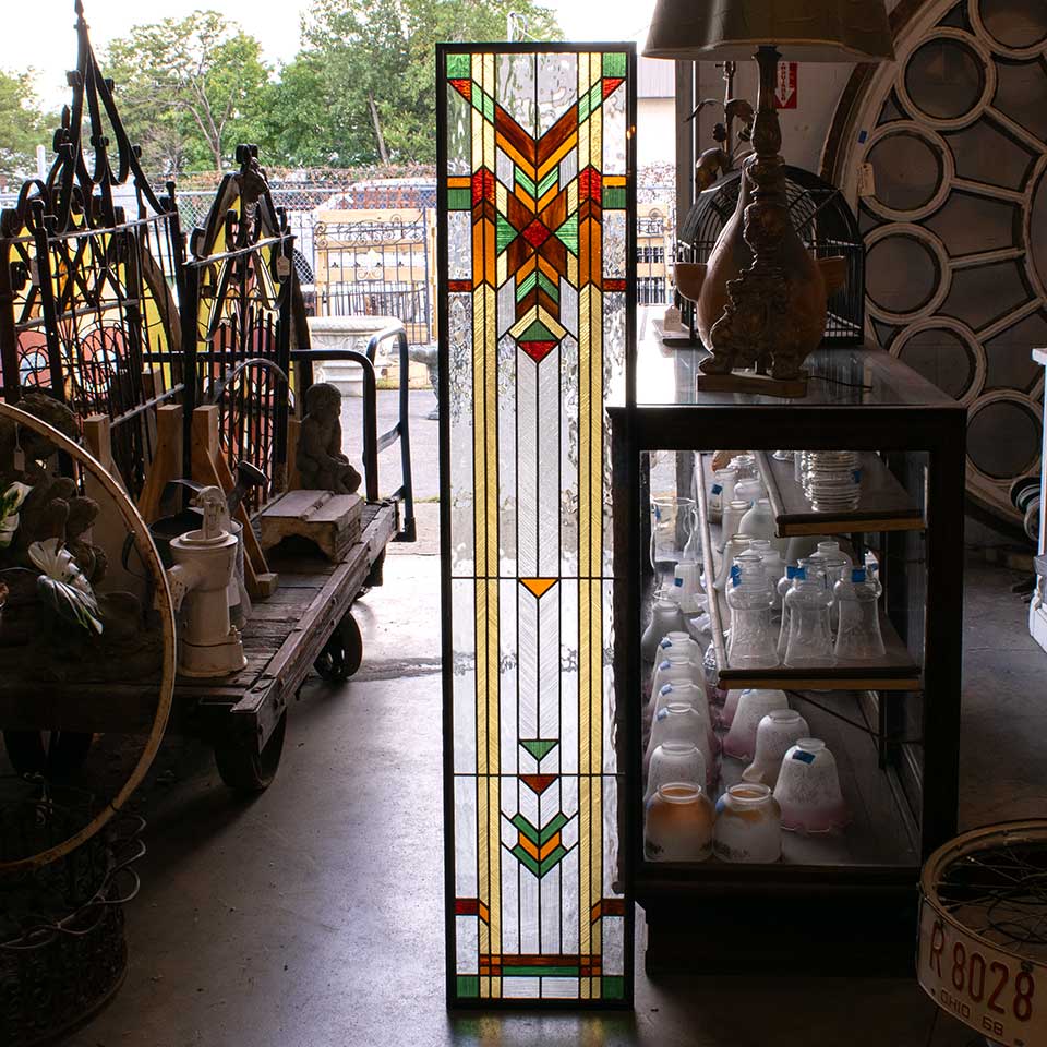 Architectural salvage Prairie style stained glass side lite panel measuring approx. 13 1/8" wide x 66" tall x 7/8" thick. This is not an antique. See photos to evaluate condition.