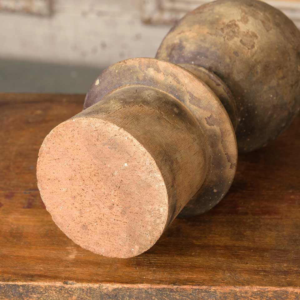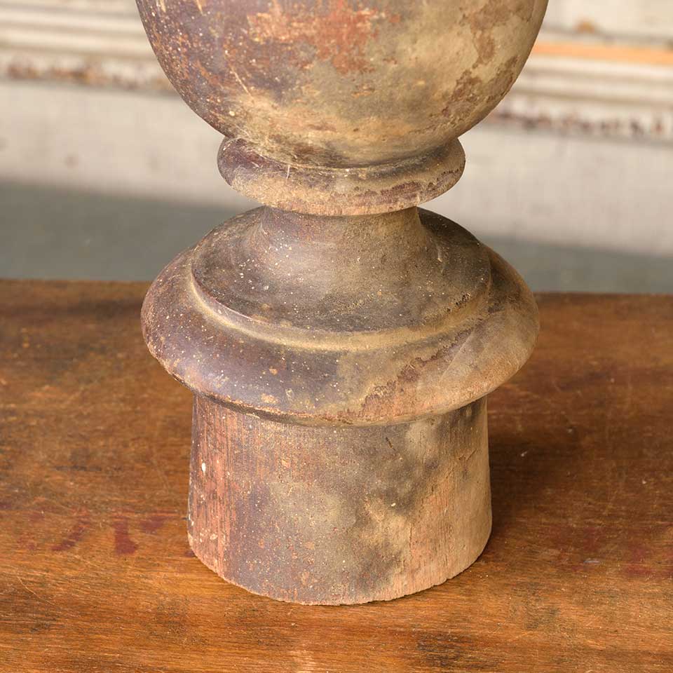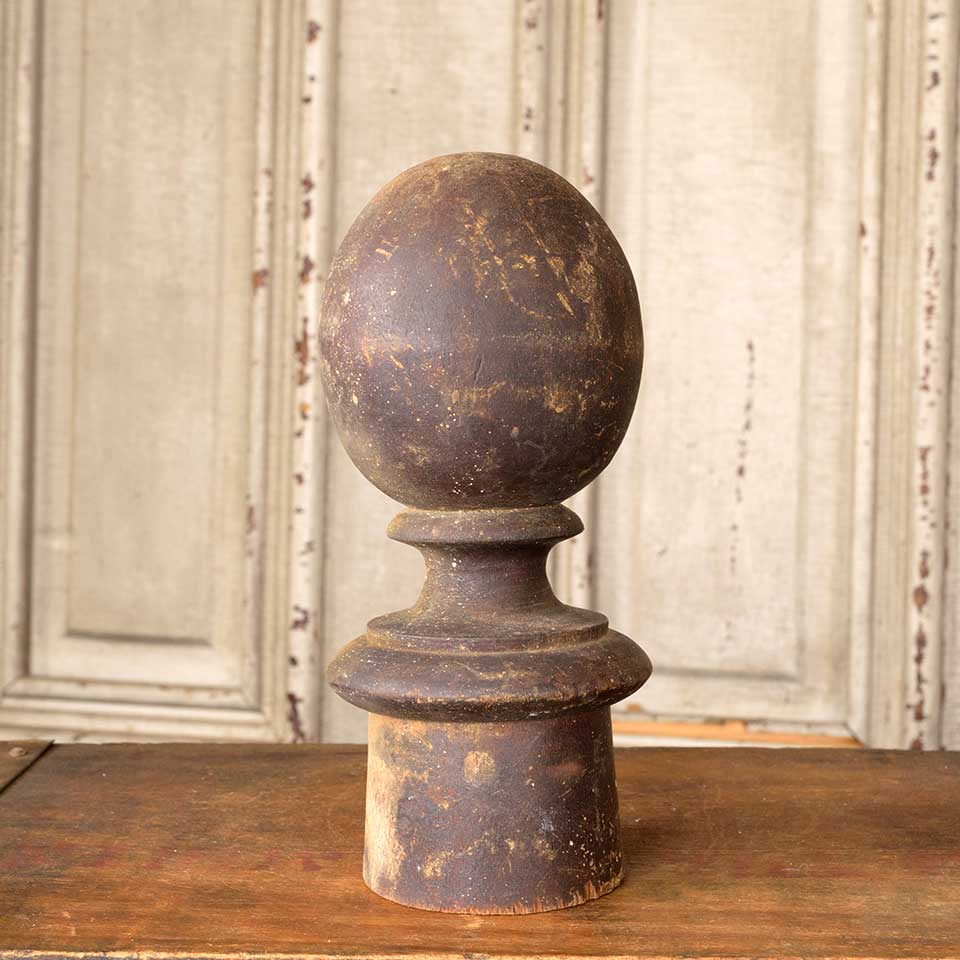 Architectural salvage antique turned wood finial measuring approx. 3 3/4" in diameter x 7 1/2" tall with a 2 5/8" diameter base. See photos to evaluate condition.