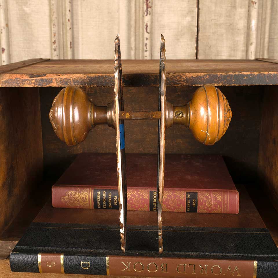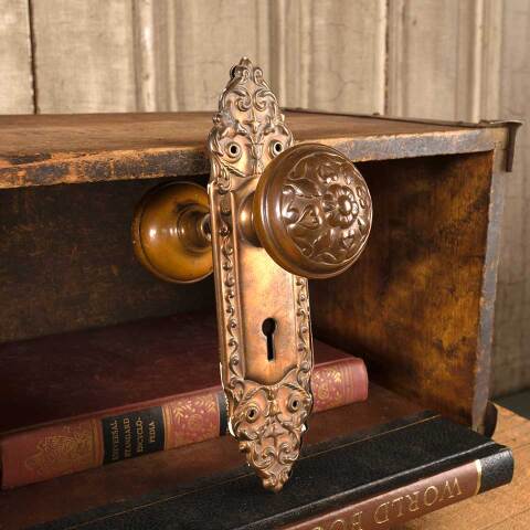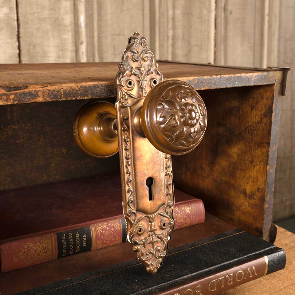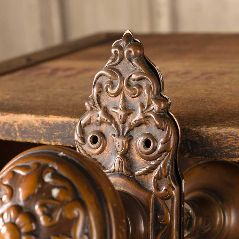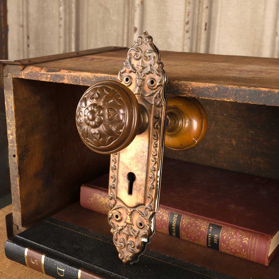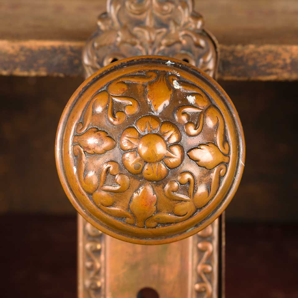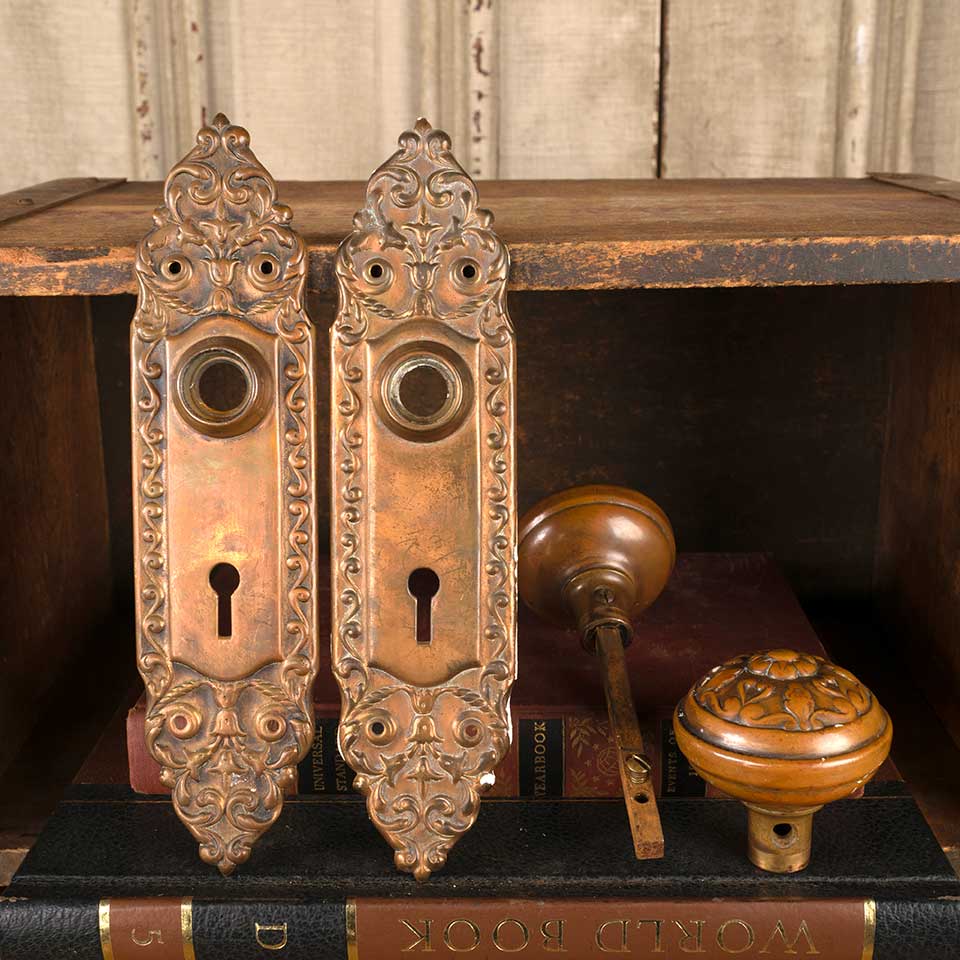 Architectural salvage antique brass Reading Hardware Company Mura pattern (circa 1897) door hardware set including two doorknobs (2 1/4" diameter), two backplates (2" wide x 8" tall), and a tapped spindle with set screws. See photos to evaluate condition. Priced at $250 for the set.
