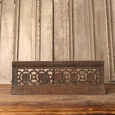 Architectural salvage antique ornate cast iron fireplace ember screen measuring approx. 20" wide x 7" tall x 2 1/4" front to back. See photos to evaluate condition.