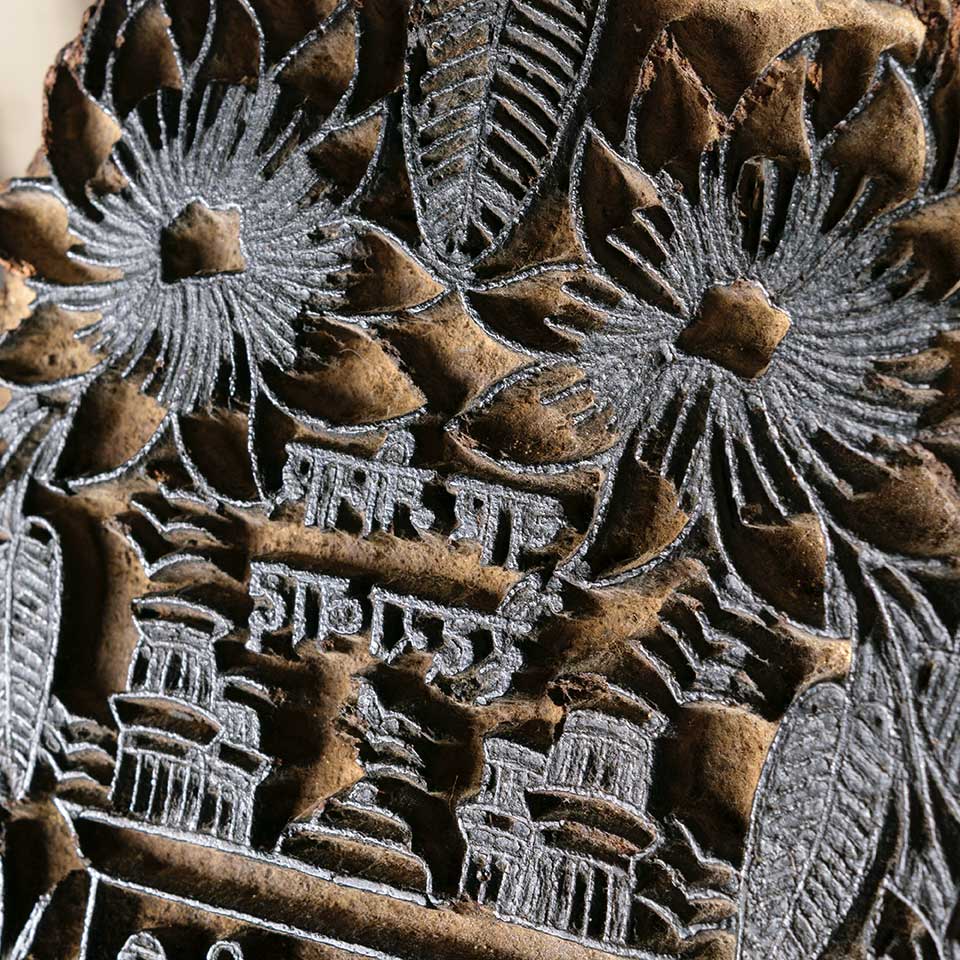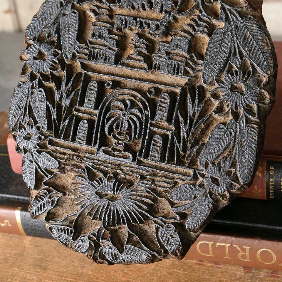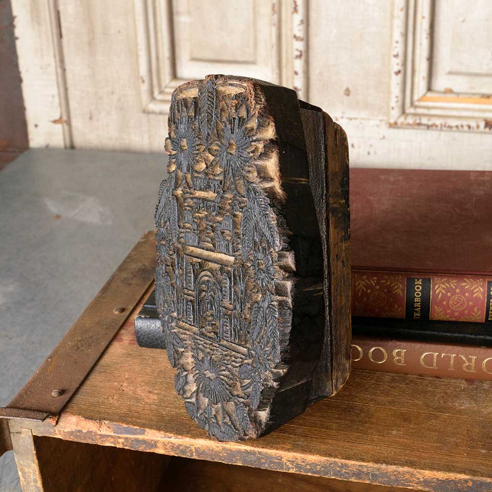 Antique hand carved wood block textile stamp measuring approx. 5" wide x 6 3/4" tall x 2 1/2" front to back. See photos to evaluate condition.