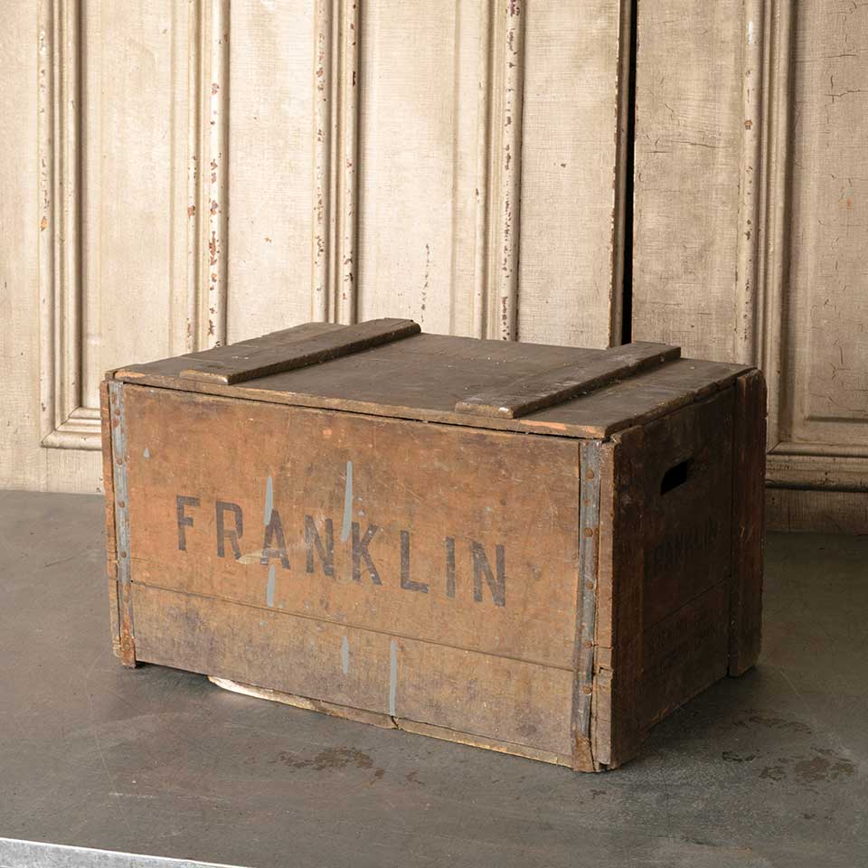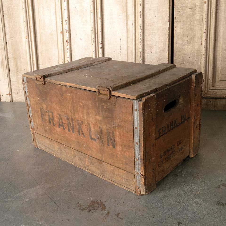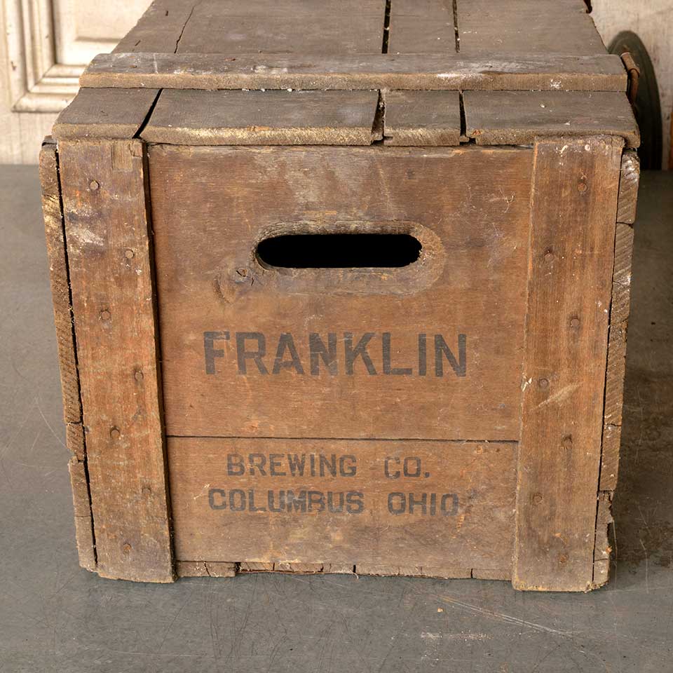 Antique wood beer bottle advertising crate with hinged lid and hand holds measuring approx. 19 5/8" wide x 11" tall x 12" front to back. Marked FRANKLIN BREWING CO COLUMBUS OHIO. There's a large hole in one bottom corner. See photos to evaluate condition.