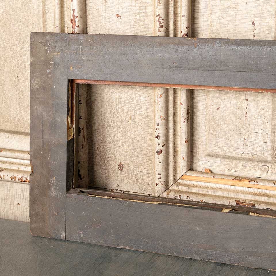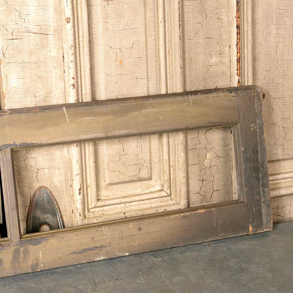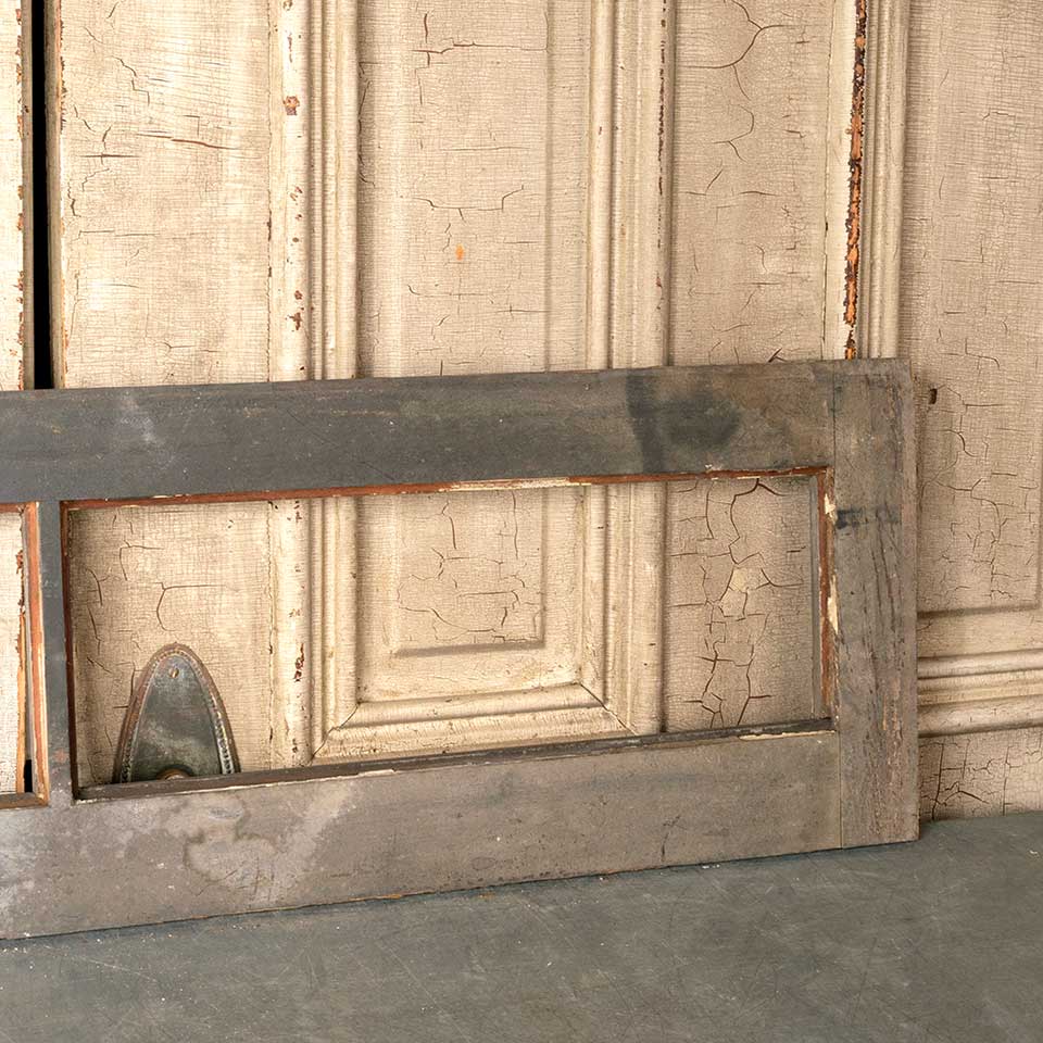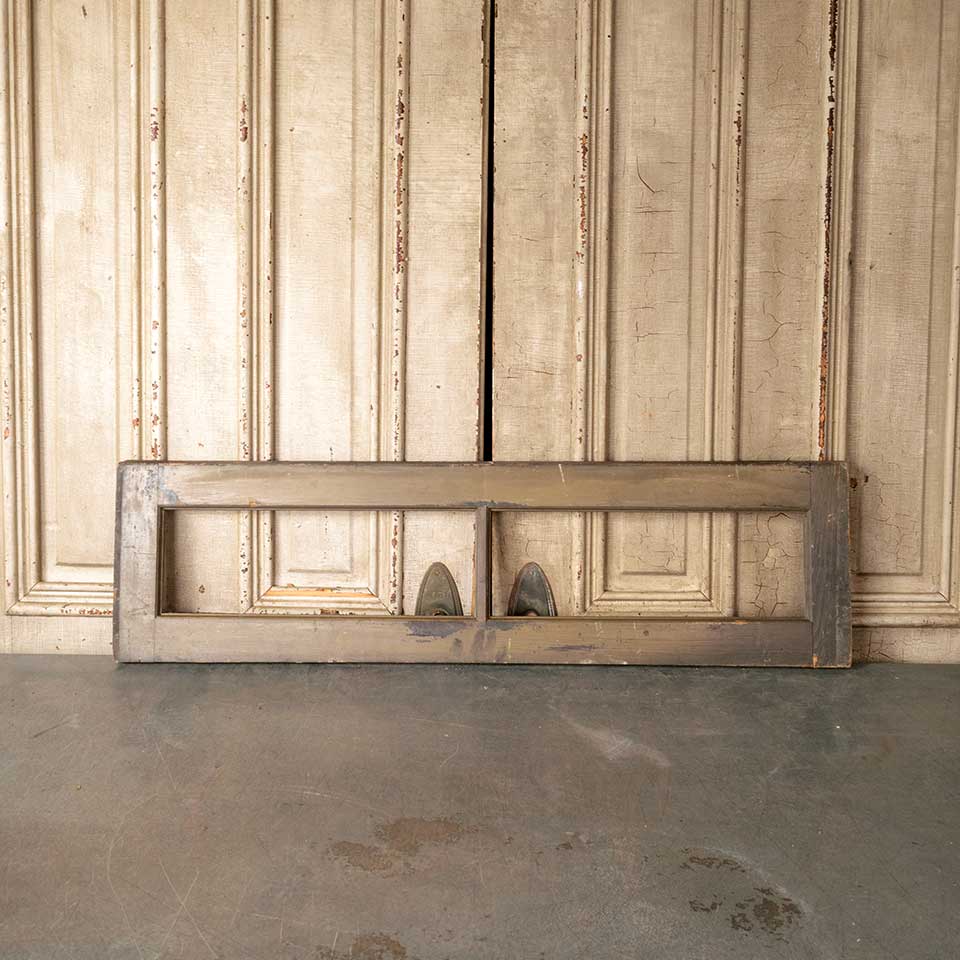 Architectural salvage antique divided two lite wood transom window measuring approx. 42 1/4" wide x 11 11/16" tall x 1 3/8" thick. Both panes of glass are missing. See photos to evaluate condition.