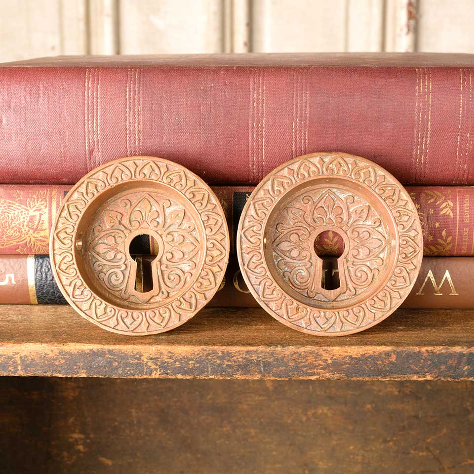 Set of two architectural salvage antique Russell & Erwin (c.1887) ornate Victorian round cast bronze pocket door hardware handle pulls with keyholes each measuring approx. 2 5/8" in diameter with a 1 15/16" diameter recessed area. See photos to evaluate condition. Priced at $150 for the two piece set.
