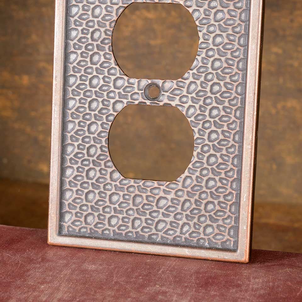 Architectural salvage vintage hammered brass electric outlet cover plate hardware measuring approx. 3 1/4" wide x 5" tall x 1/4" front to back. Color and condition may vary.