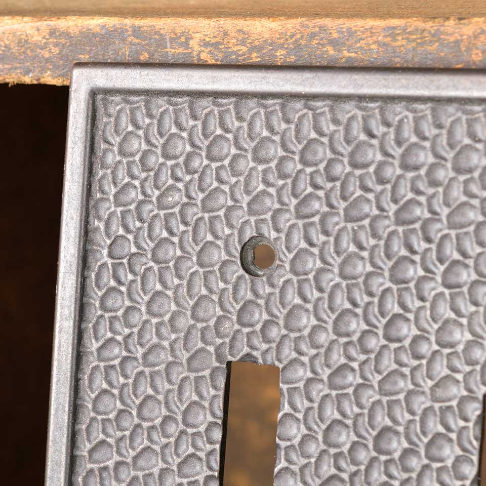 Architectural salvage vintage hammered brass double light switch cover plate hardware measuring approx. 5" wide x 5" tall x 1/4" front to back. See photos to evaluate condition.