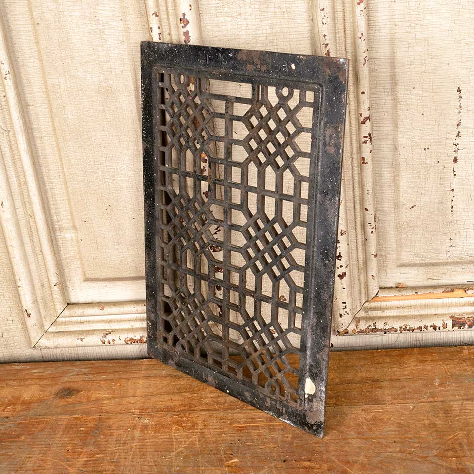 Architectural salvage antique cast iron heat grate floor vent cover measuring approx. 8" x 12" (insert dimensions) and 9 3/4" x 13 5/8" (overall dimensions). There are no louvers with this heat grate. See photos to evaluate condition.