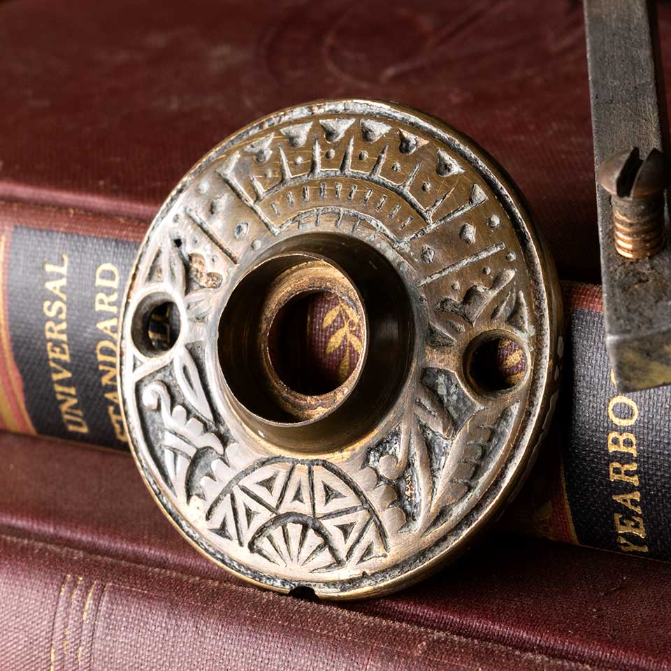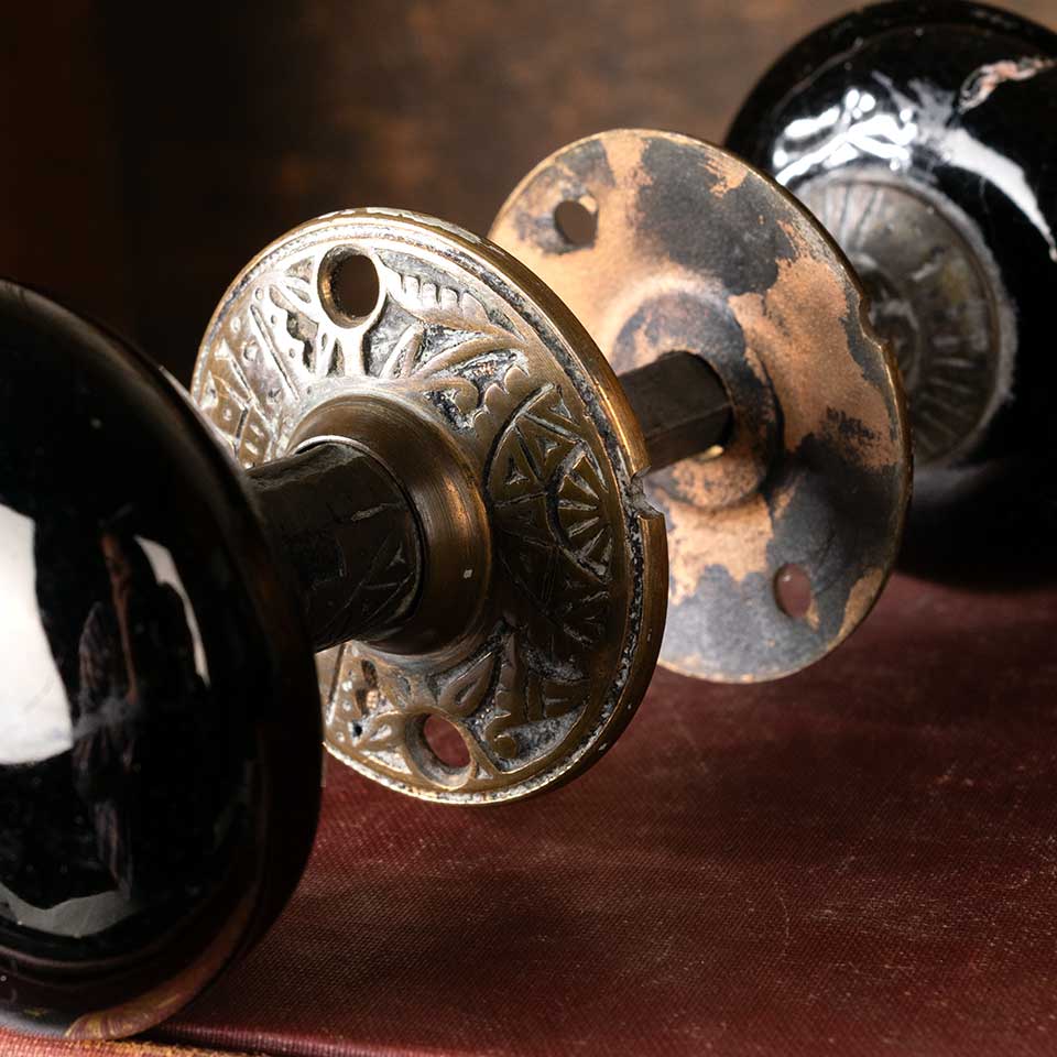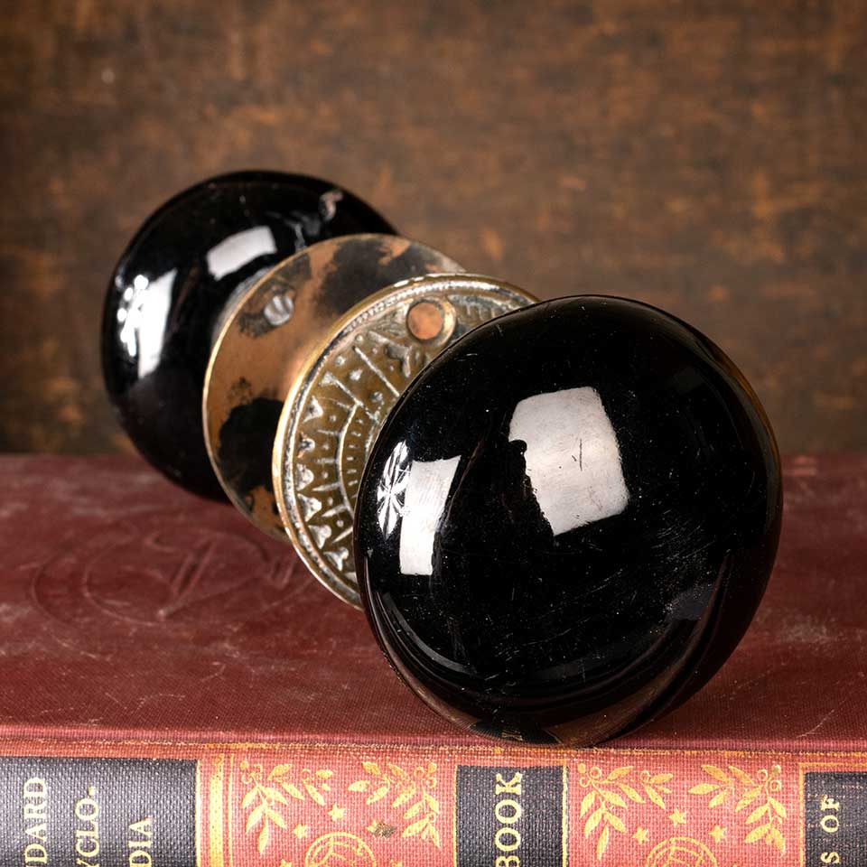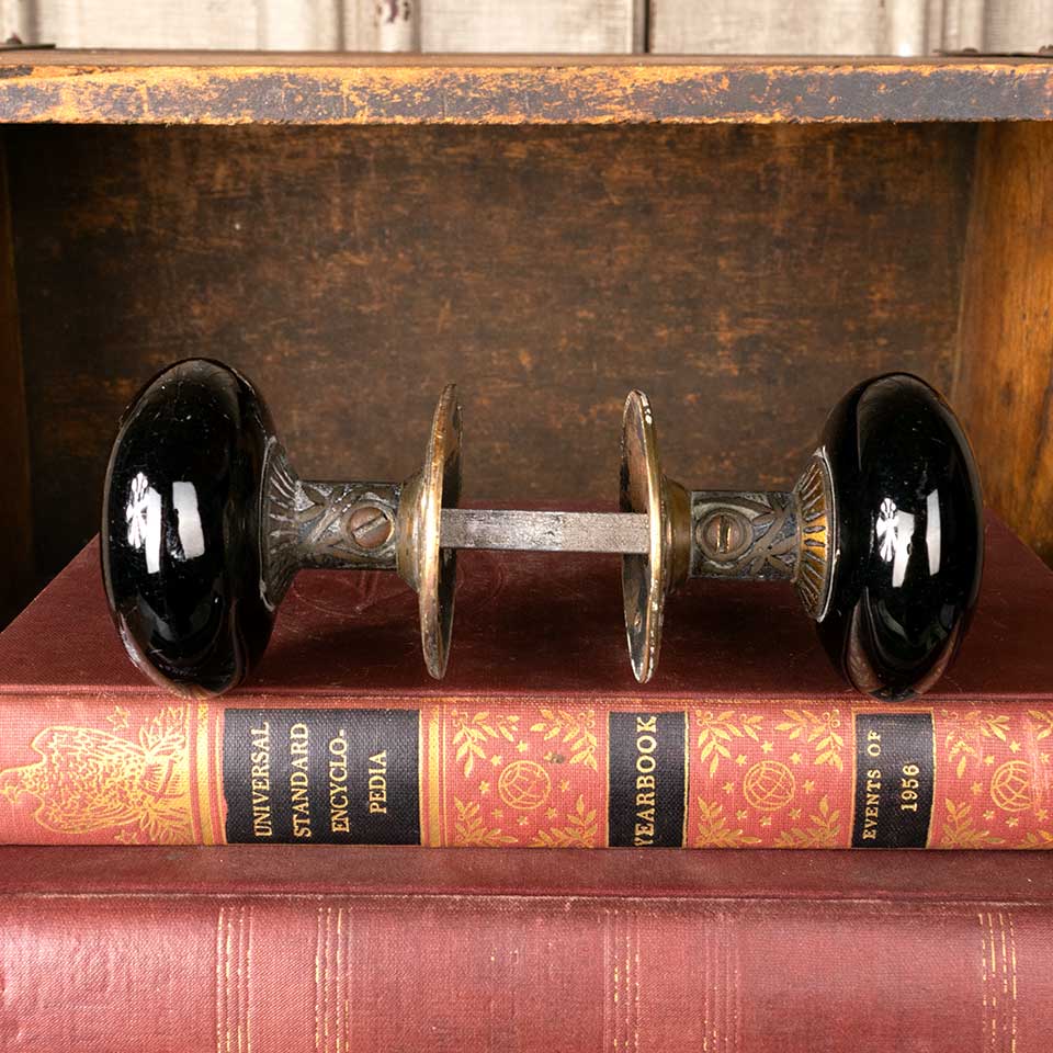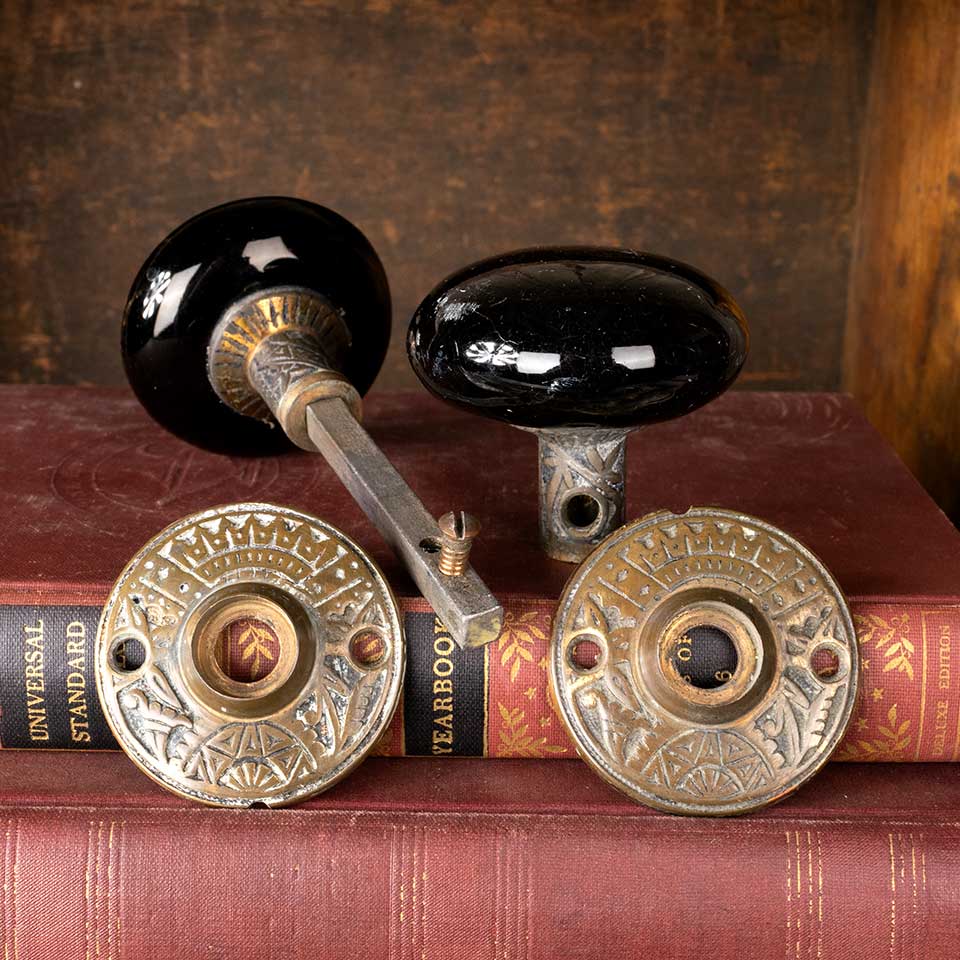 Architectural salvage antique Victorian black porcelain doorknob door hardware set with ornate brass shank / stem and rosette backplates. The set includes 2 doorknobs (2 1/4" in diameter); and 2 matching rosettes (2" in diameter); and a tapped spindle with set screws. There's a notch the outer rim of both rosettes. See photos to evaluate condition. Priced at $150 for the set.