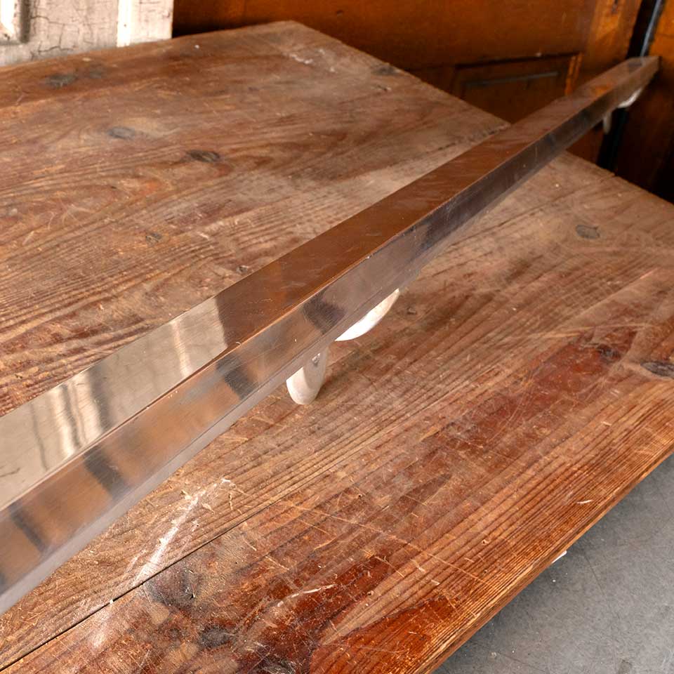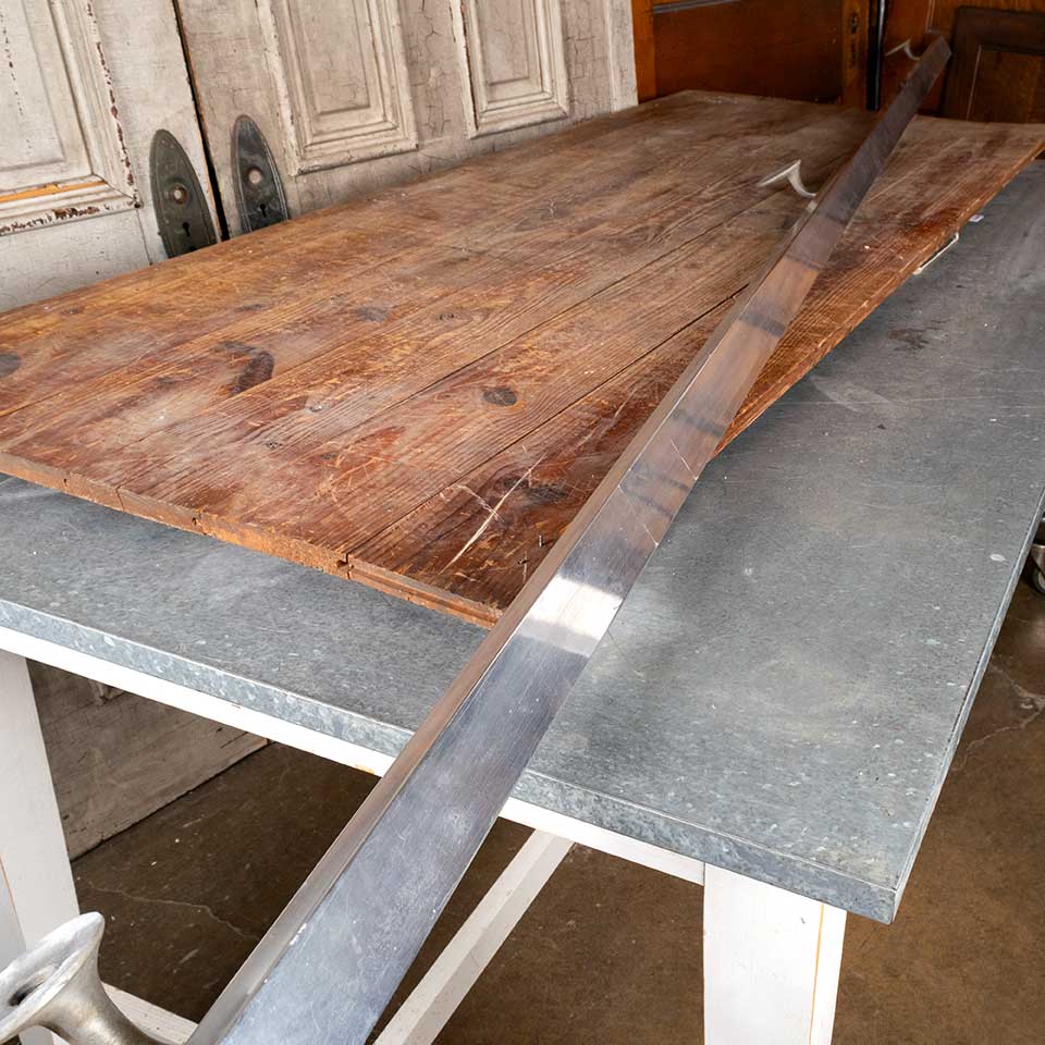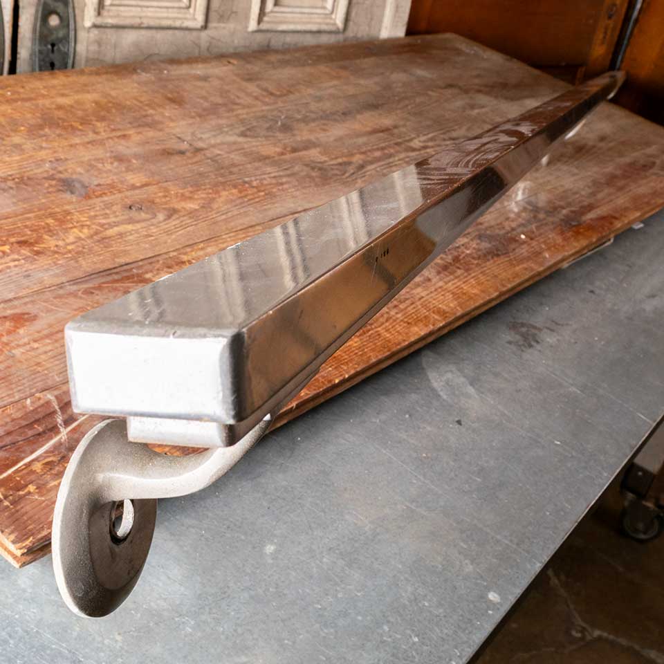 Architectural salvage vintage mid century modern aluminum handrail with three wall brackets measuring approx. 120 1/2" long x 1 1/2" tall (5" tall including wall bracket) x 2" wide (3 1/2" wide including wall bracket). See photos to evaluate condition.