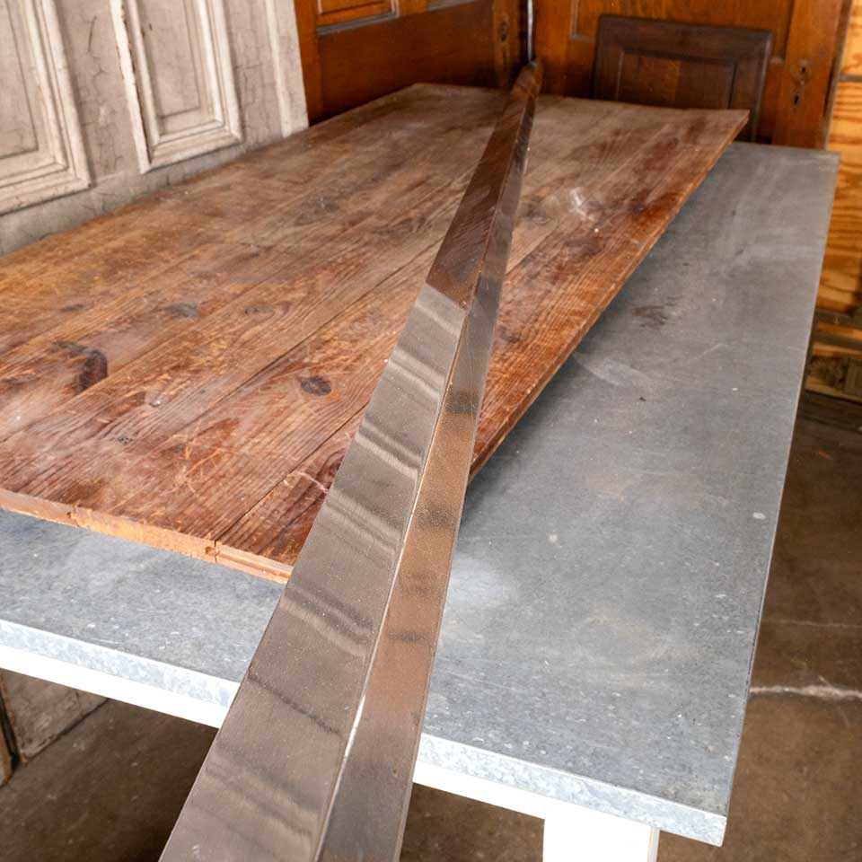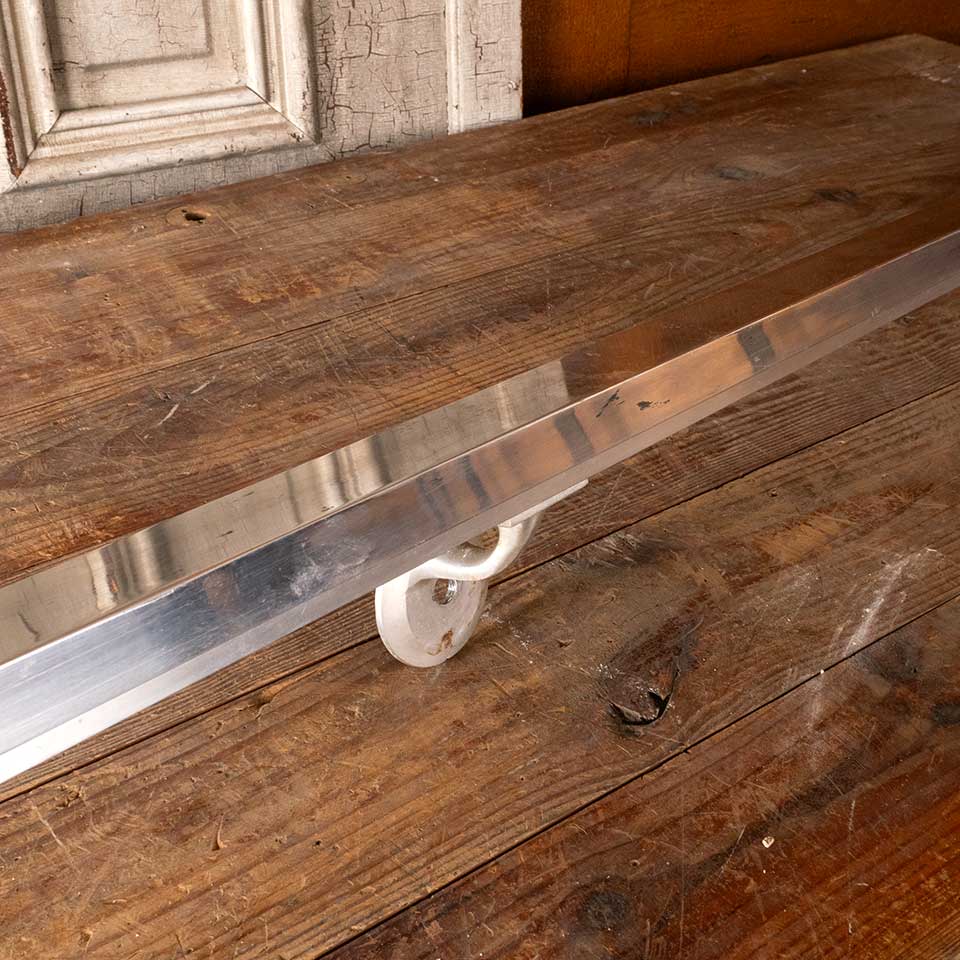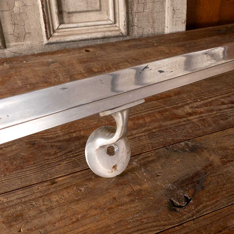Architectural salvage vintage mid century modern aluminum handrail with three wall brackets measuring approx. 120 1/2" long x 1 1/2" tall (5" tall including wall bracket) x 2" wide (3 1/2" wide including wall bracket). See photos to evaluate condition.