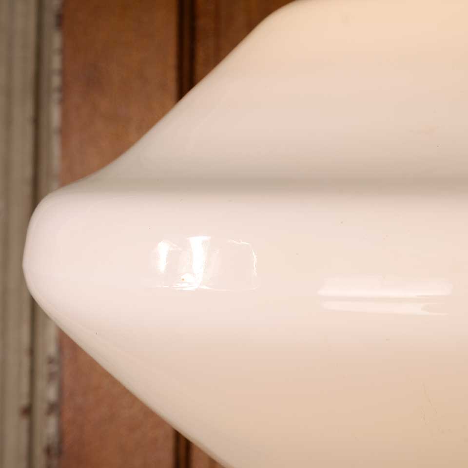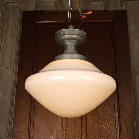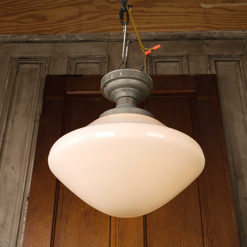 Architectural salvage antique single bulb flush mount schoolhouse ceiling light fixture with milk glass globe measuring approximately 16" in diameter x 15" tall (overall). Salvaged lighting should be inspected by a licensed electrician prior to installation.
