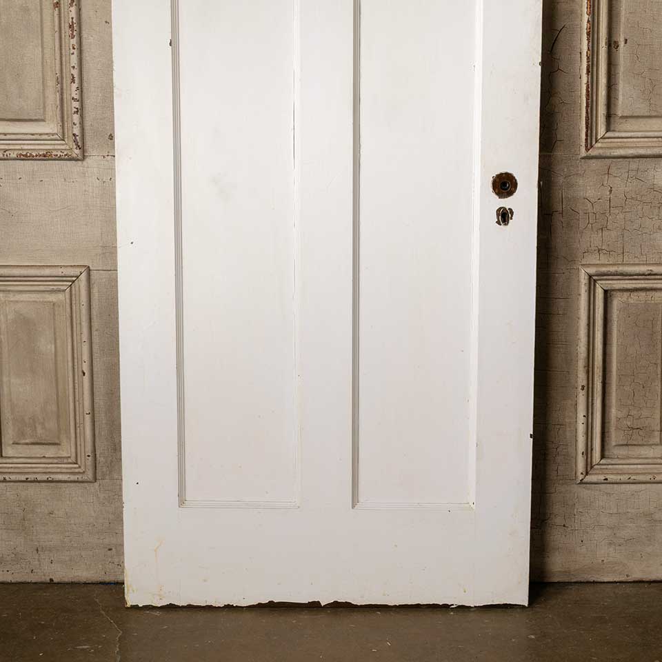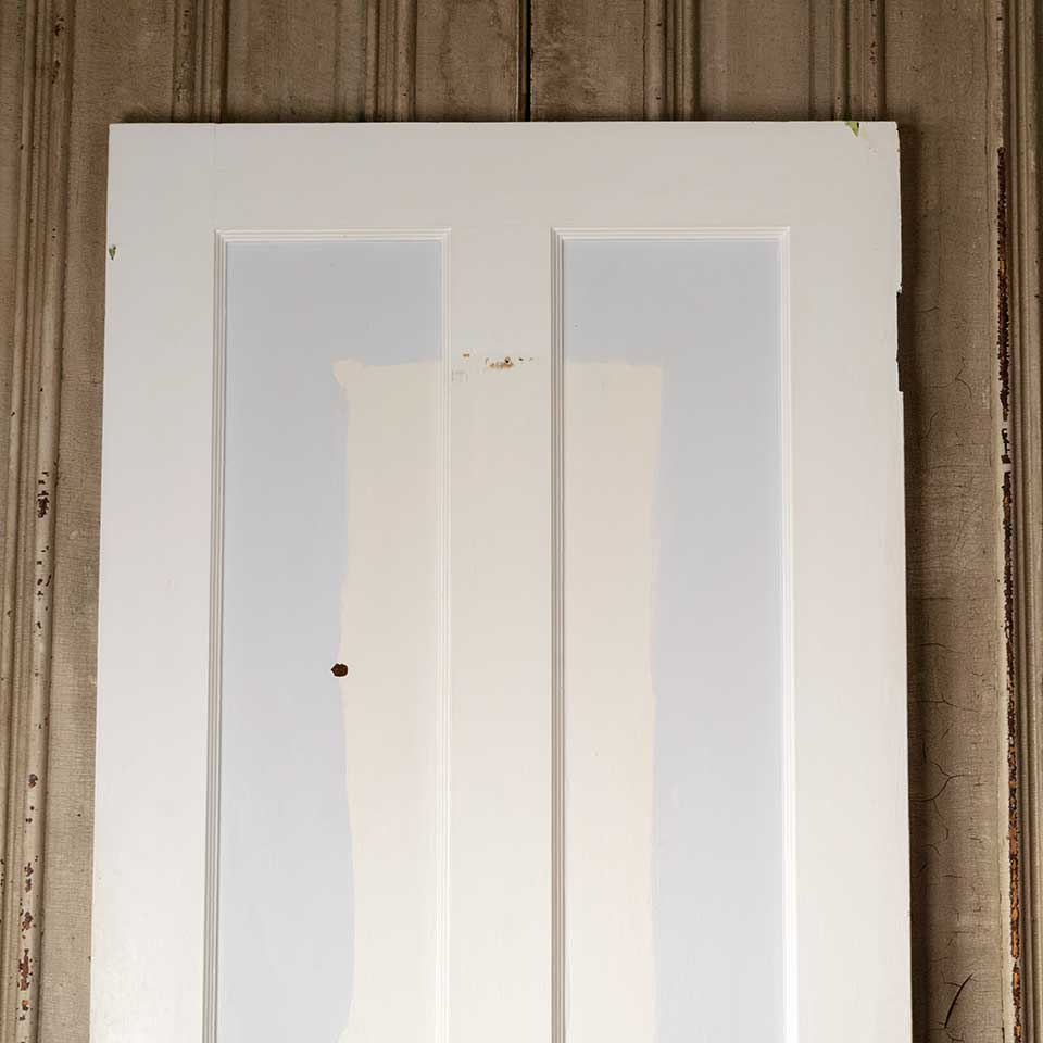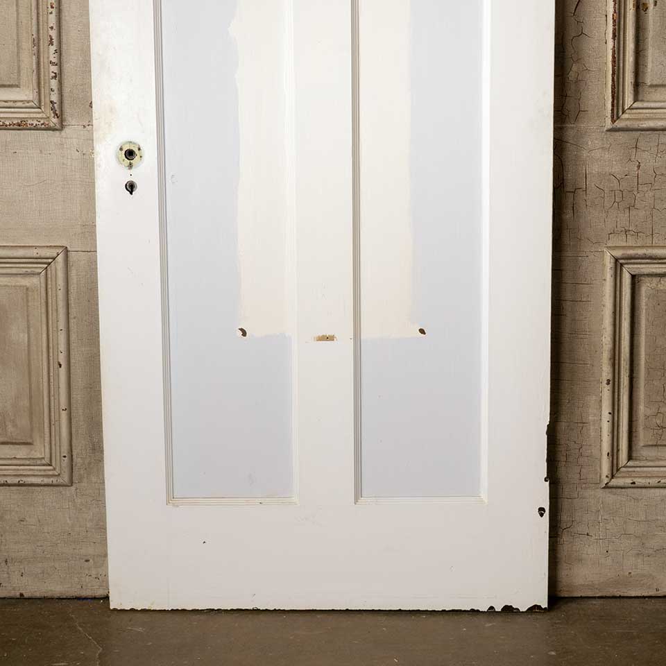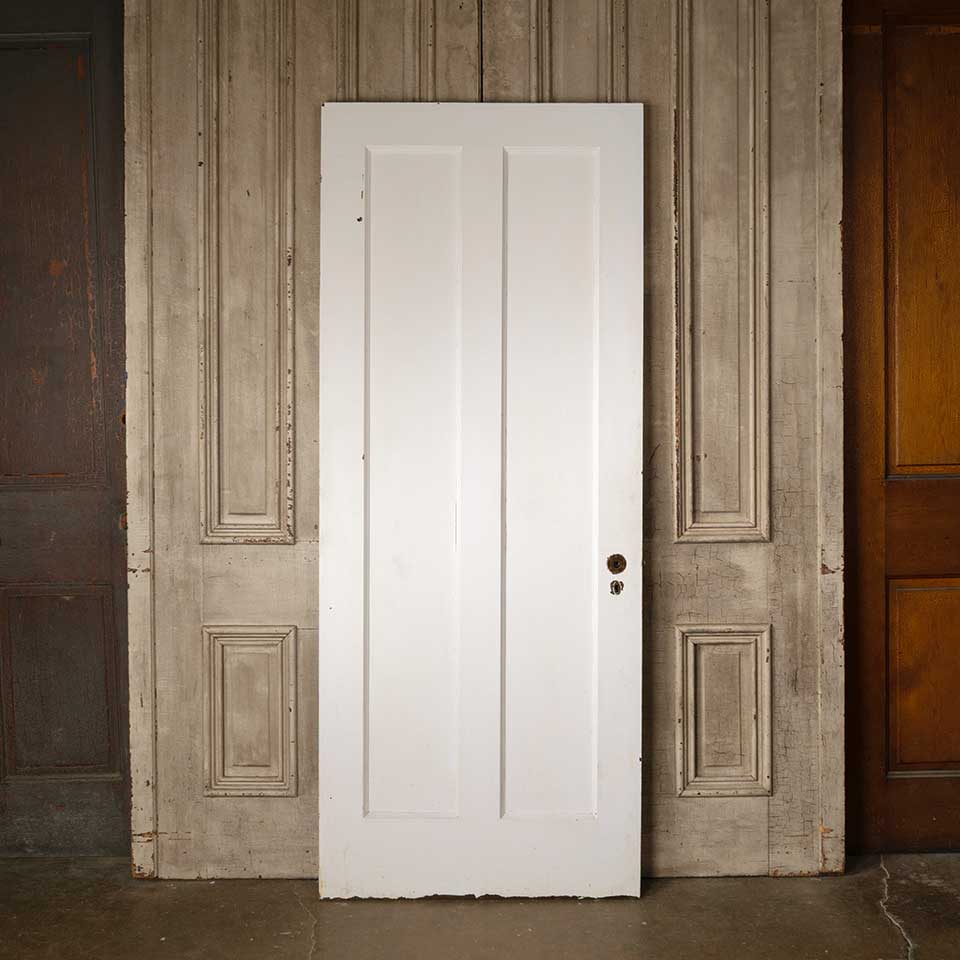 Architectural salvage antique painted wood vertical two panel interior door with mortise lock measuring approx. 32" wide x 79" tall x 1 3/8" thick. There's some wood loss on one side of the door. See photos to evaluate condition.