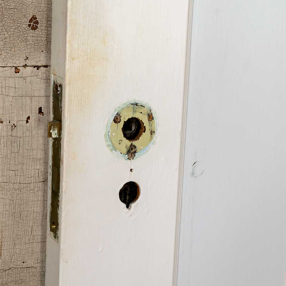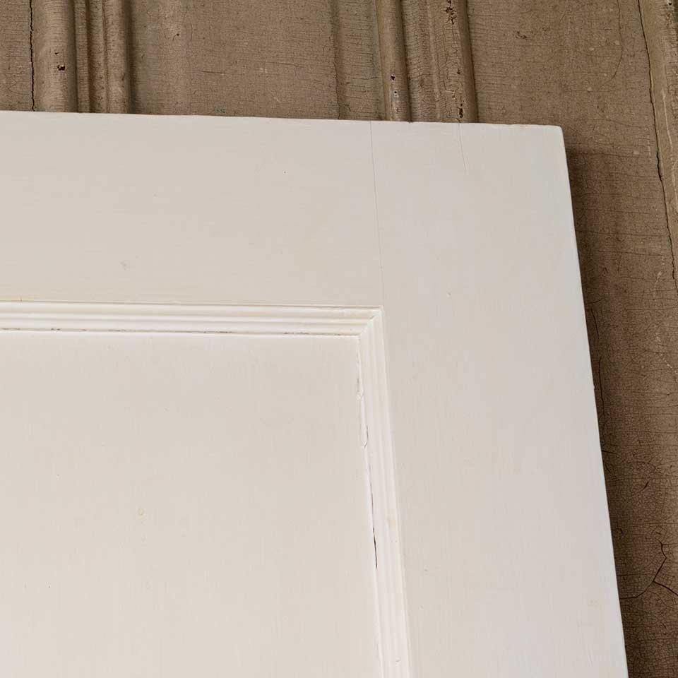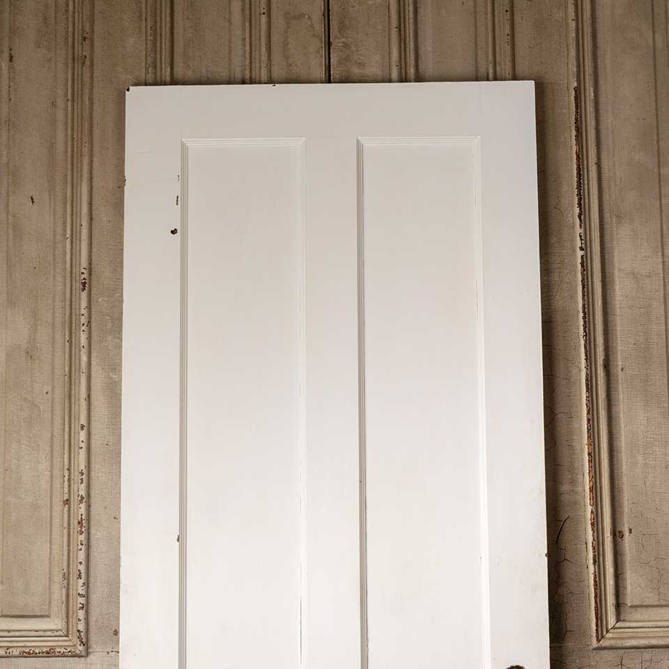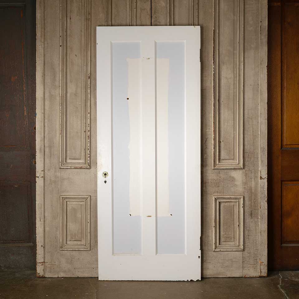 Architectural salvage antique painted wood vertical two panel interior door with mortise lock measuring approx. 32" wide x 79" tall x 1 3/8" thick. There's some wood loss on one side of the door. See photos to evaluate condition.