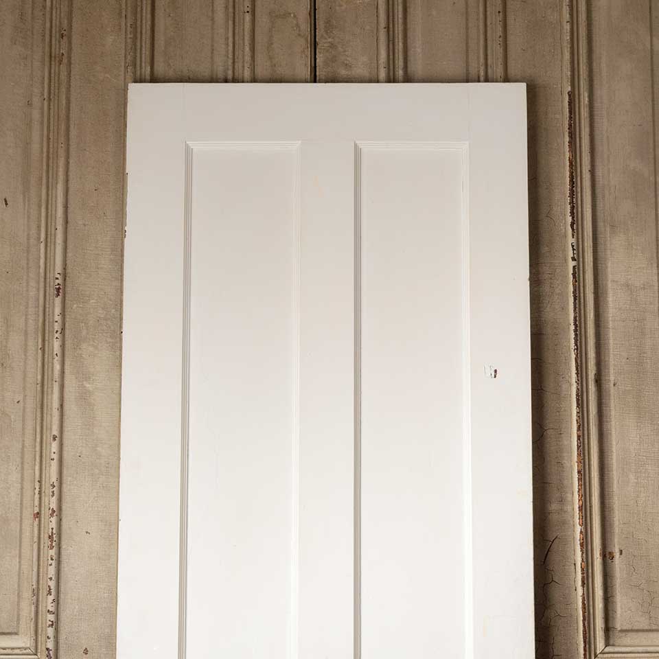 Architectural salvage antique painted wood vertical two panel interior door with mortise lock measuring approx. 30" wide x 79 1/8" tall x 1 3/8" thick. See photos to evaluate condition.