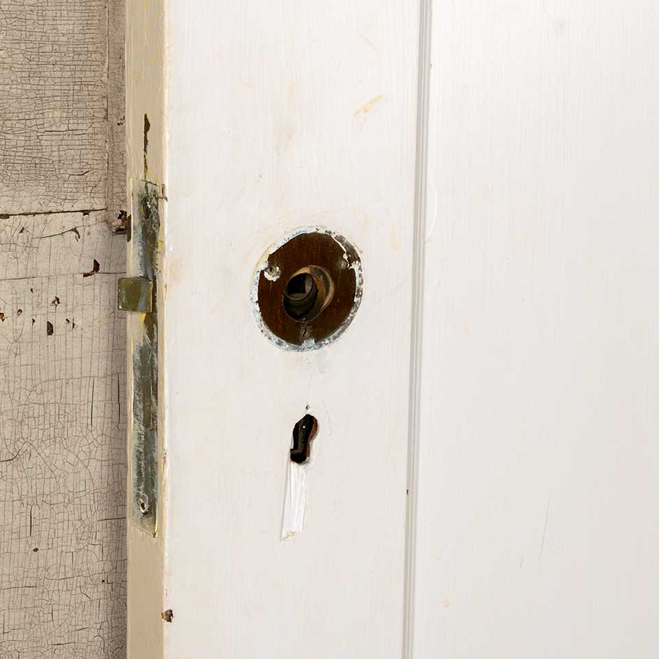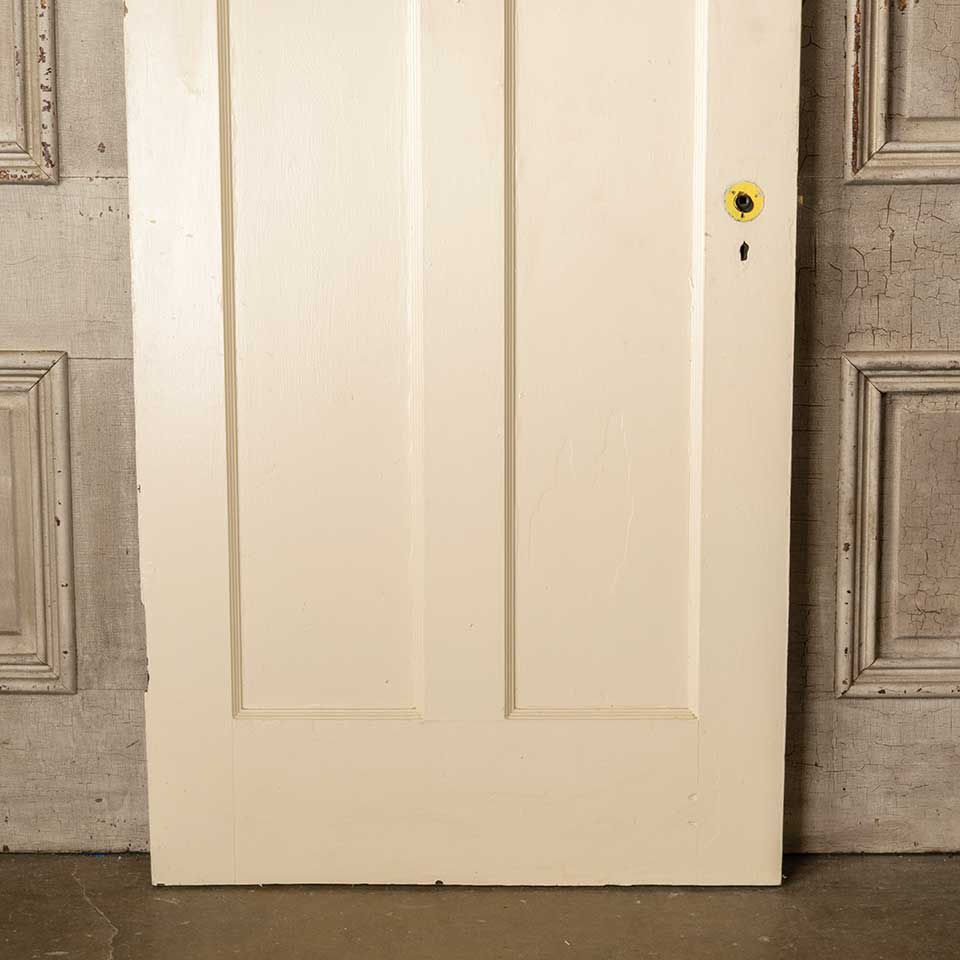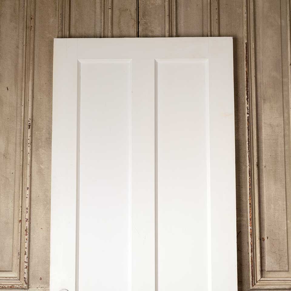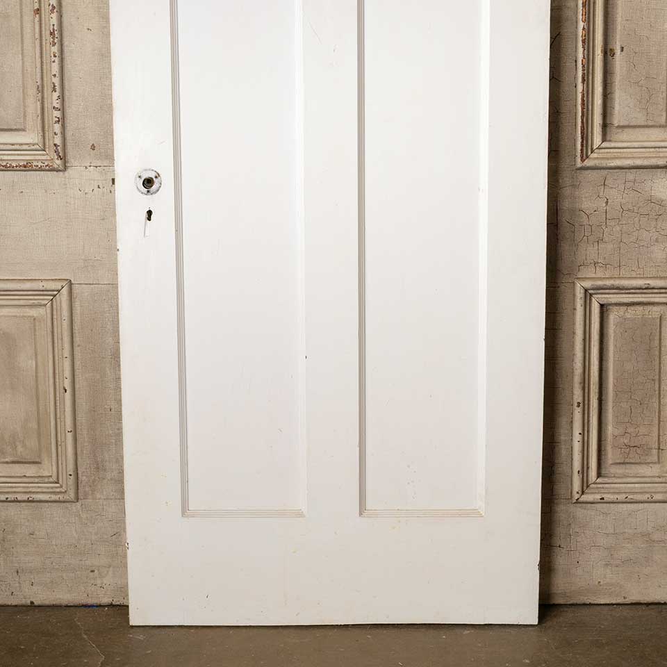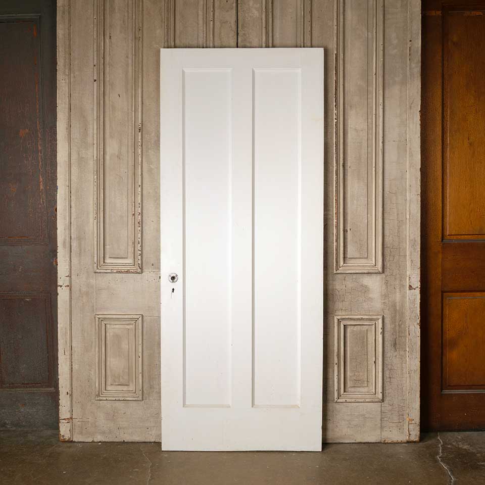 Architectural salvage antique painted wood vertical two panel interior door with mortise lock measuring approx. 31 7/8" wide x 79 1/4" tall x 1 3/8" thick. See photos to evaluate condition.