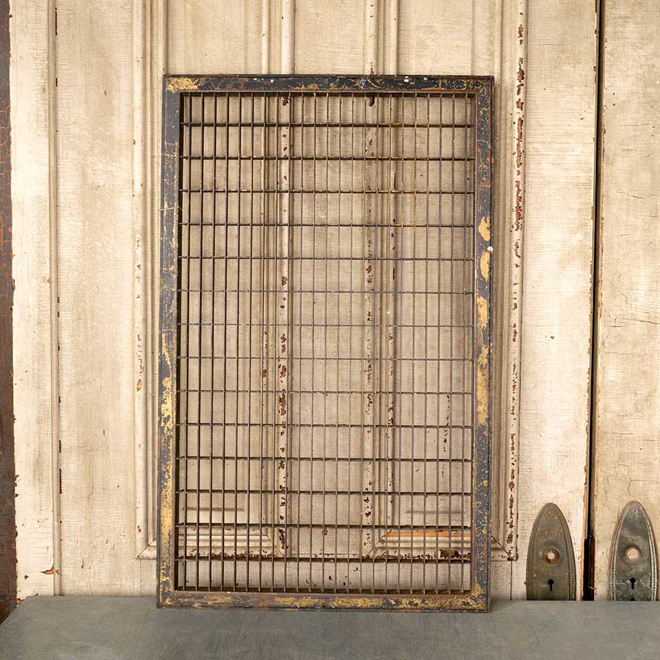 Architectural salvage vintage metal cold air return floor grate vent cover measuring approx. 17 3/4" x 29 3/4" (insert dimensions) and 19 7/8" x 31 7/8" (overall dimensions). See photos to evaluate condition.