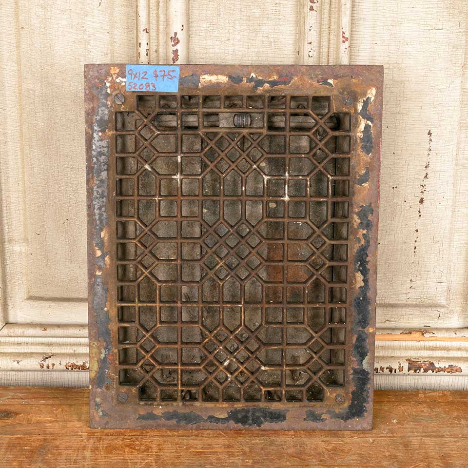 Architectural salvage antique cast iron heat grate floor vent cover with operable louvers measuring approx. 9" x 12" (insert dimensions) and 10 7/8" x 13 7/8" (overall dimensions). See photos to evaluate condition.