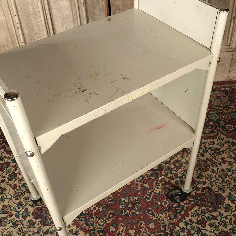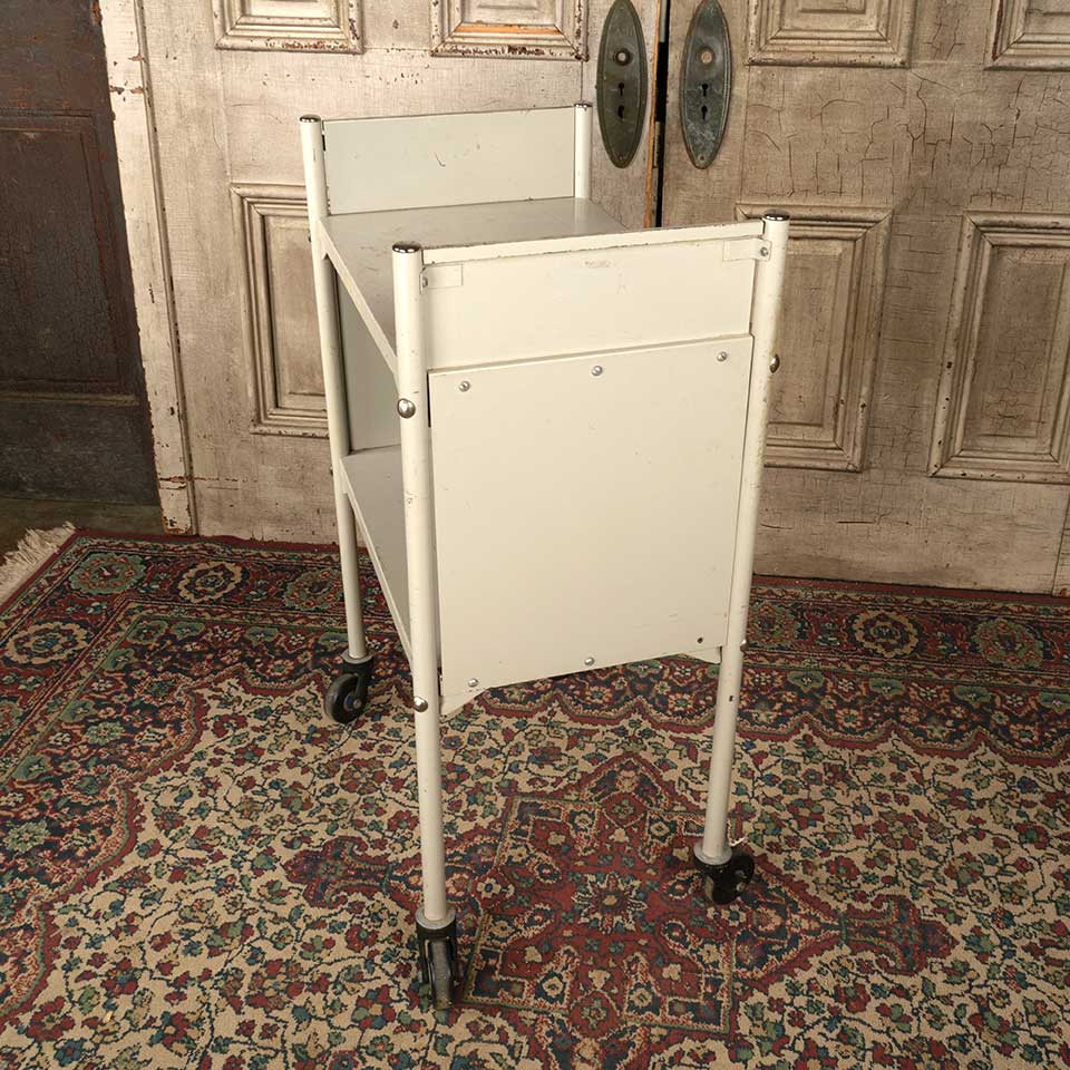 Architectural salvage vintage rolling metal library book cart measuring approx. 22 1/8" wide x 34 7/8" tall x 14 5/8" front to back. See photos to evaluate condition.