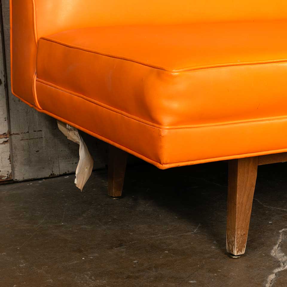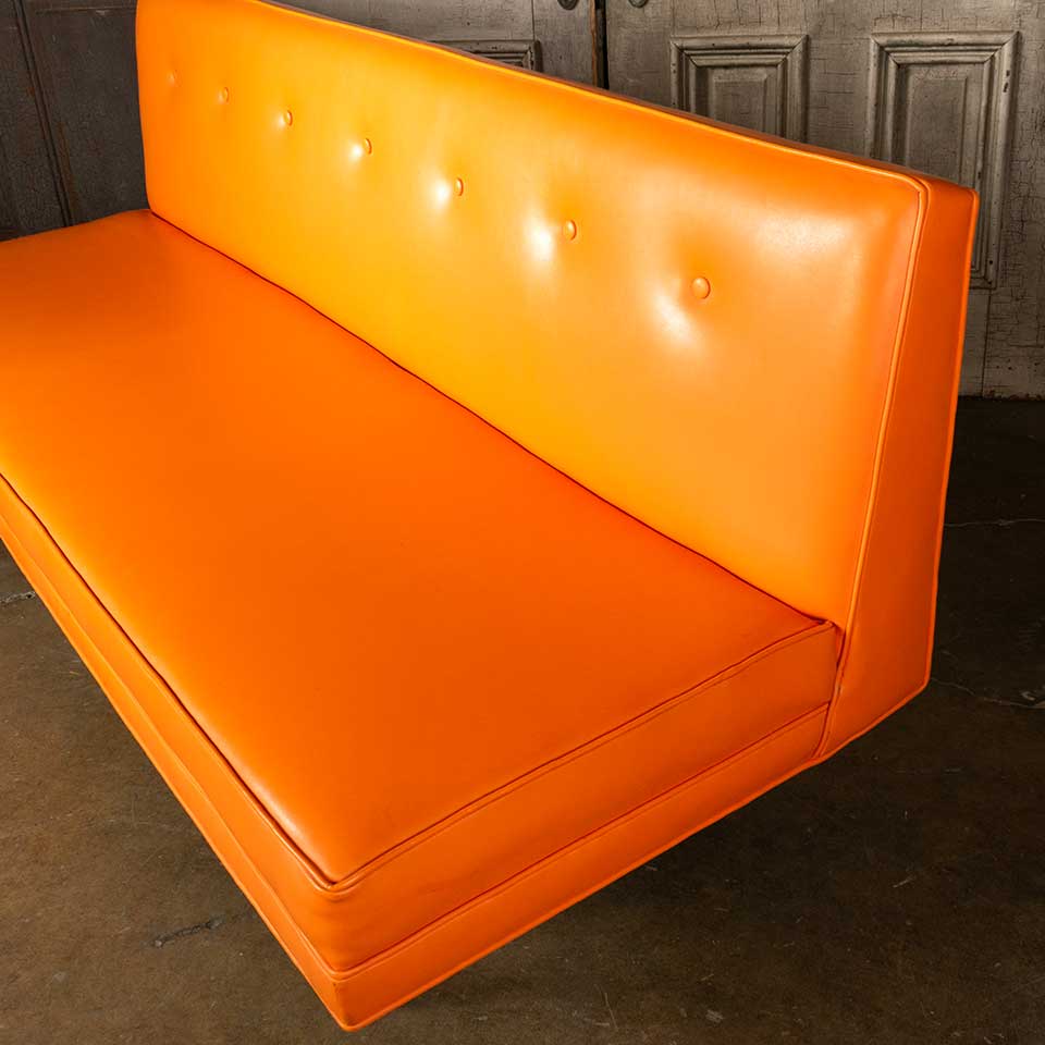 Architectural salvage vintage Mid-Century Modern Toledo Showcase Tiger Lily orange couch measuring approx. 73" wide x 32 1/4" tall x 28" front to back. See photos to evaluate condition.