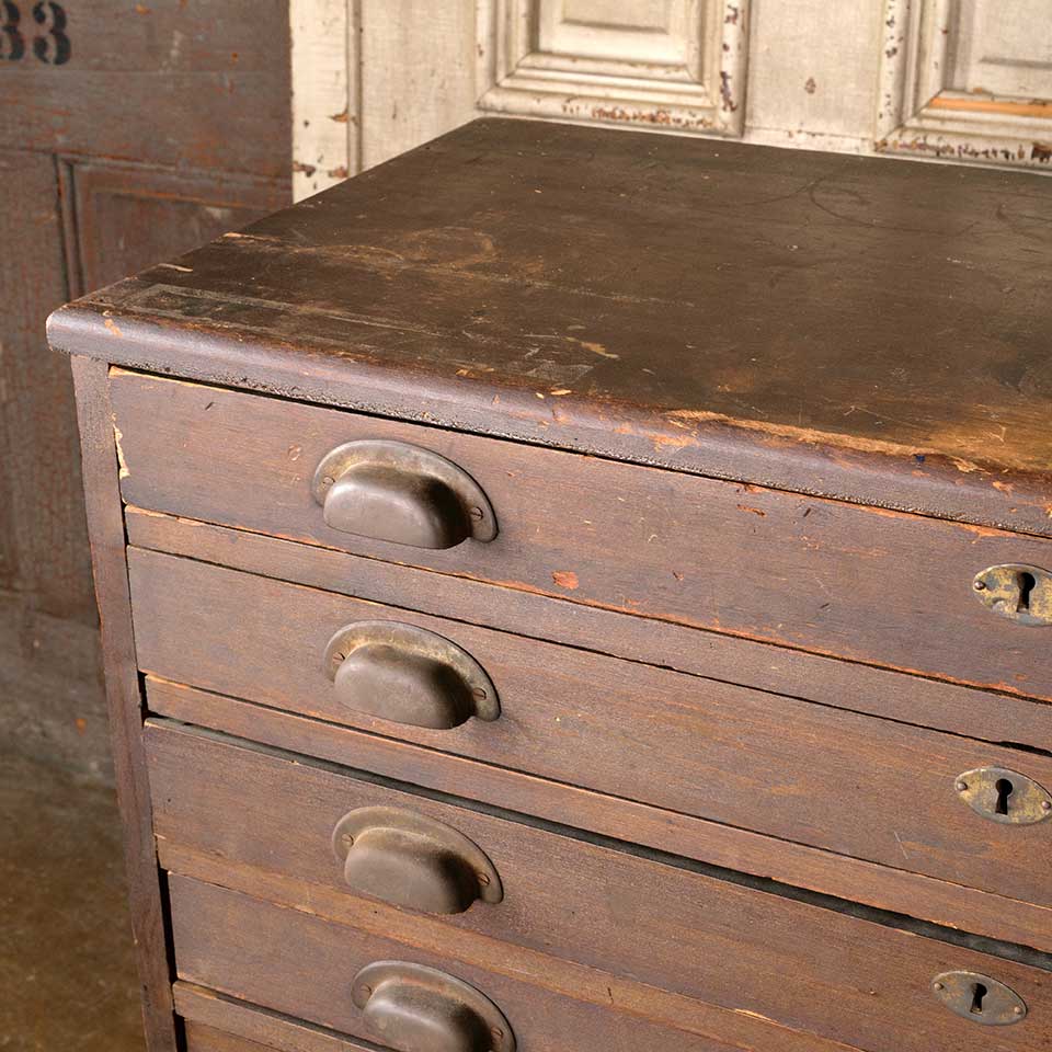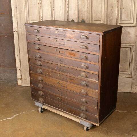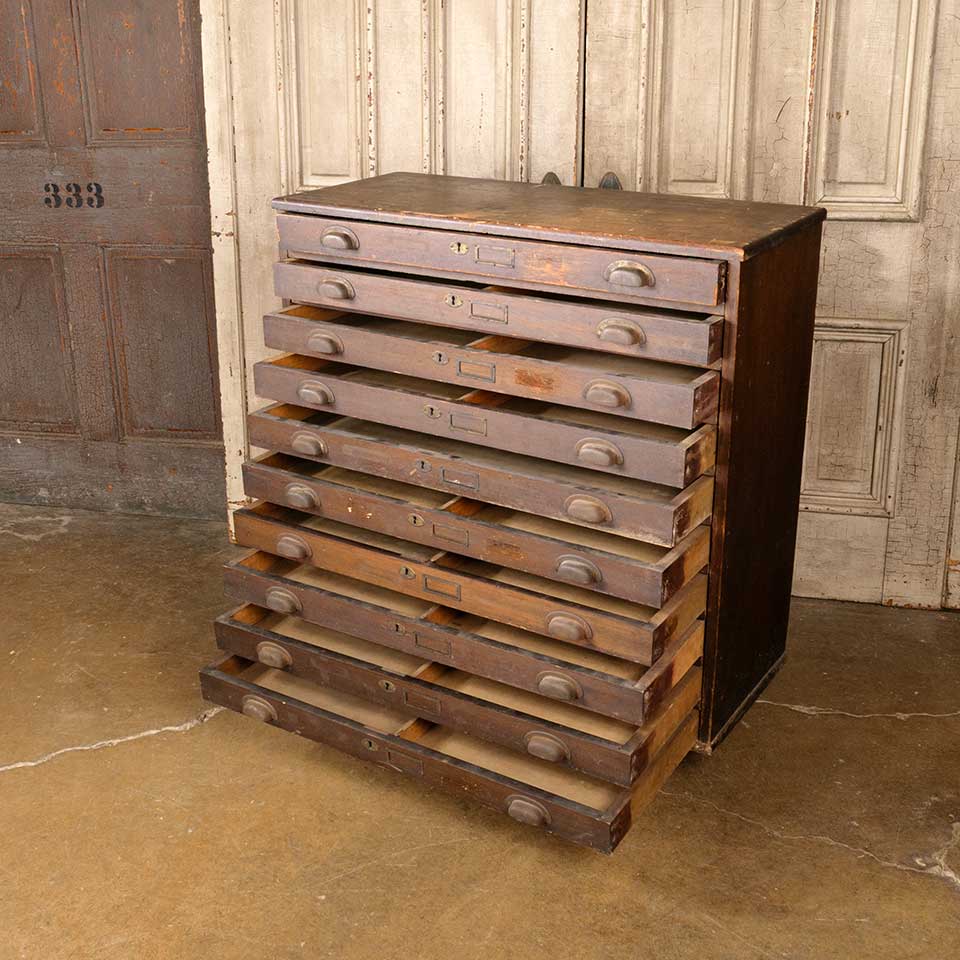 Architectural salvage antique wood flat drawer file cabinet with ten drawers measuring approx. 36" wide x 34 3/4" tall x 15 1/8" front to back. See photos to evaluate condition.