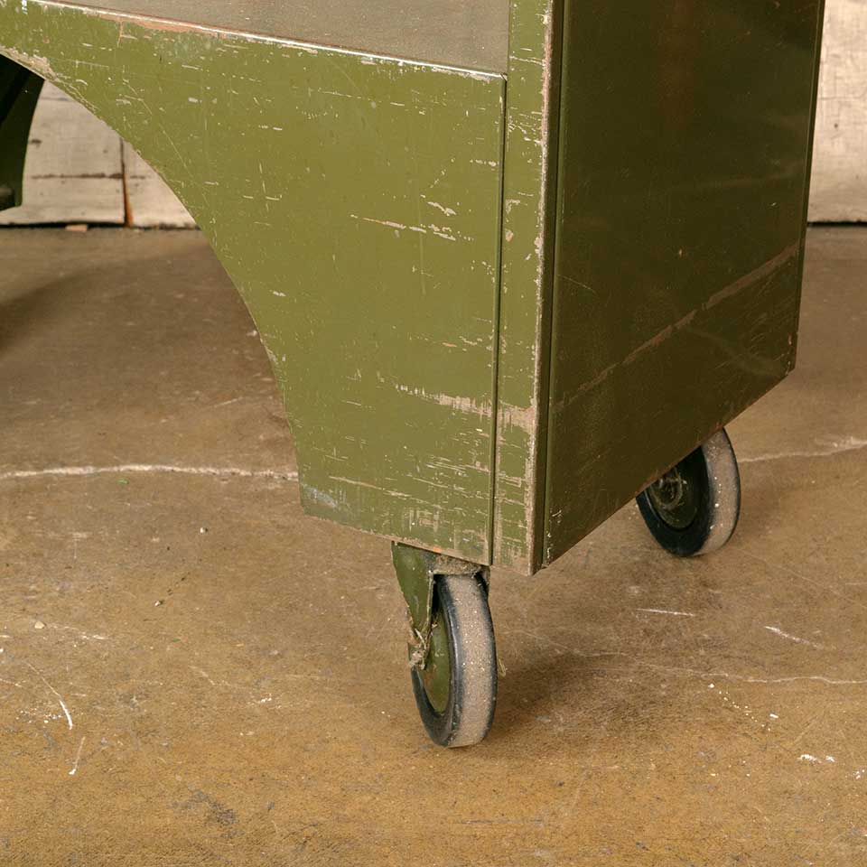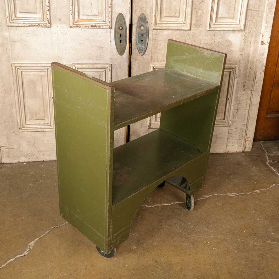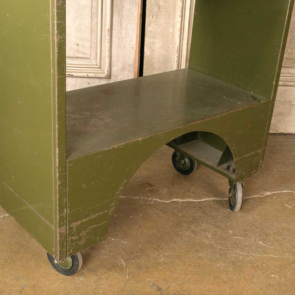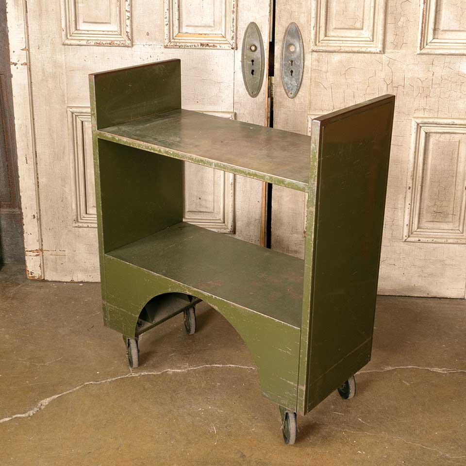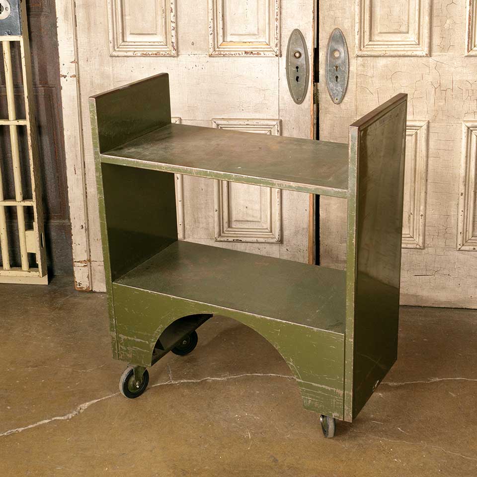 Architectural salvage vintage rolling metal library book cart measuring approx. 30" wide x 35 1/2" tall x 14" front to back. See photos to evaluate condition.
