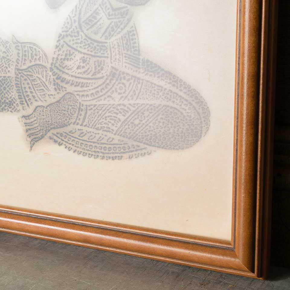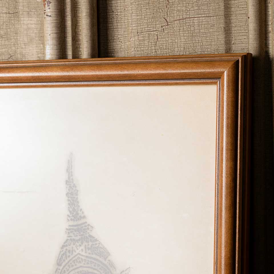 Wood framed Thai temple rubbing artwork measuring approx. 24 3/4" wide x 21 3/4" tall x 7/8" front to back. See photos to evaluate condition.