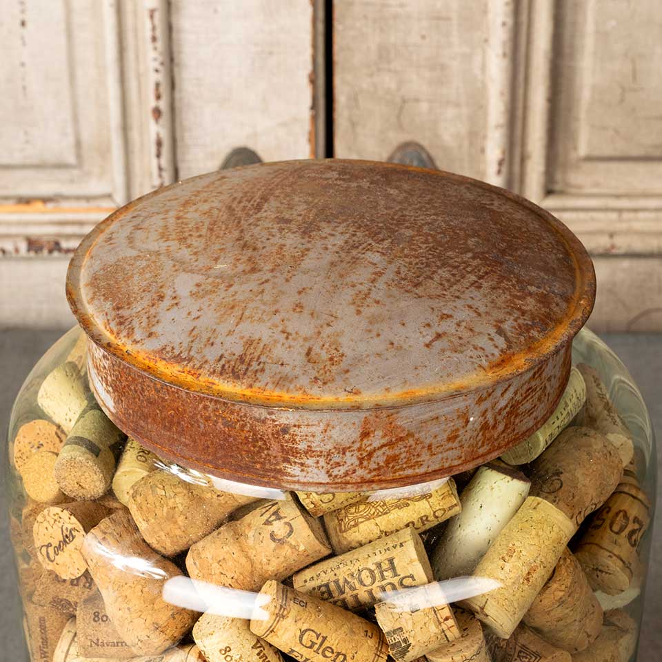 Large glass jar with removable metal lid and filled with wine bottle corks measuring approx. 10 1/2" in diameter x 14 1/4" tall. See photos to evaluate condition.