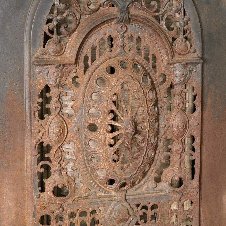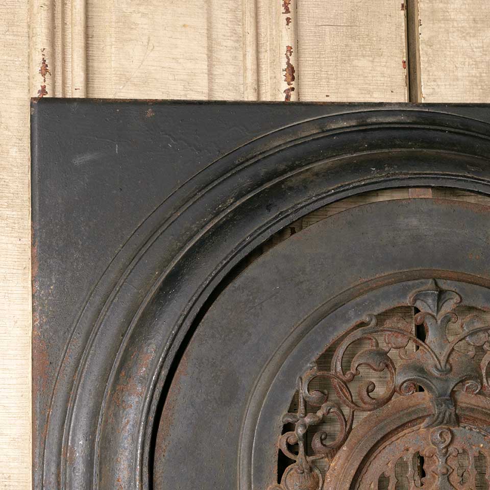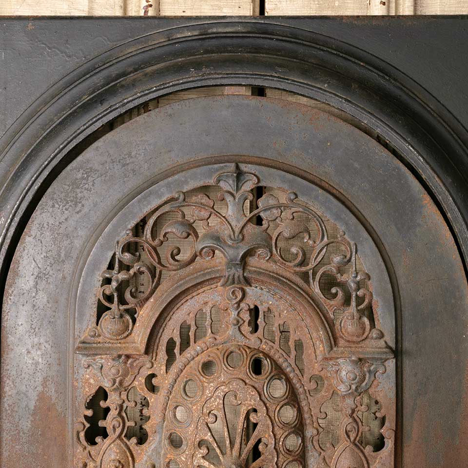Architectural salvage hard to find antique two piece cast iron fireplace surround and arched top summer front cover set. The fireplace surround measures approx. 27" wide x 37" tall x 2 1/2" front to back. The summer front cover measures approx. 19 15/16" wide (at bottom) x 27" tall x 1 1/2" front to back. See photos to evaluate condition. Priced at $925 for the 2 piece set.