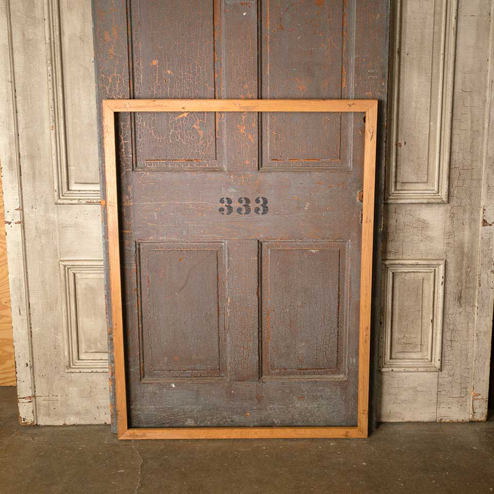 Architectural salvage oak wood trim frame measuring approx. 37 1/2" x 49 3/4" with an opening 34 3/8" x 46 1/2". Color and condition may vary.