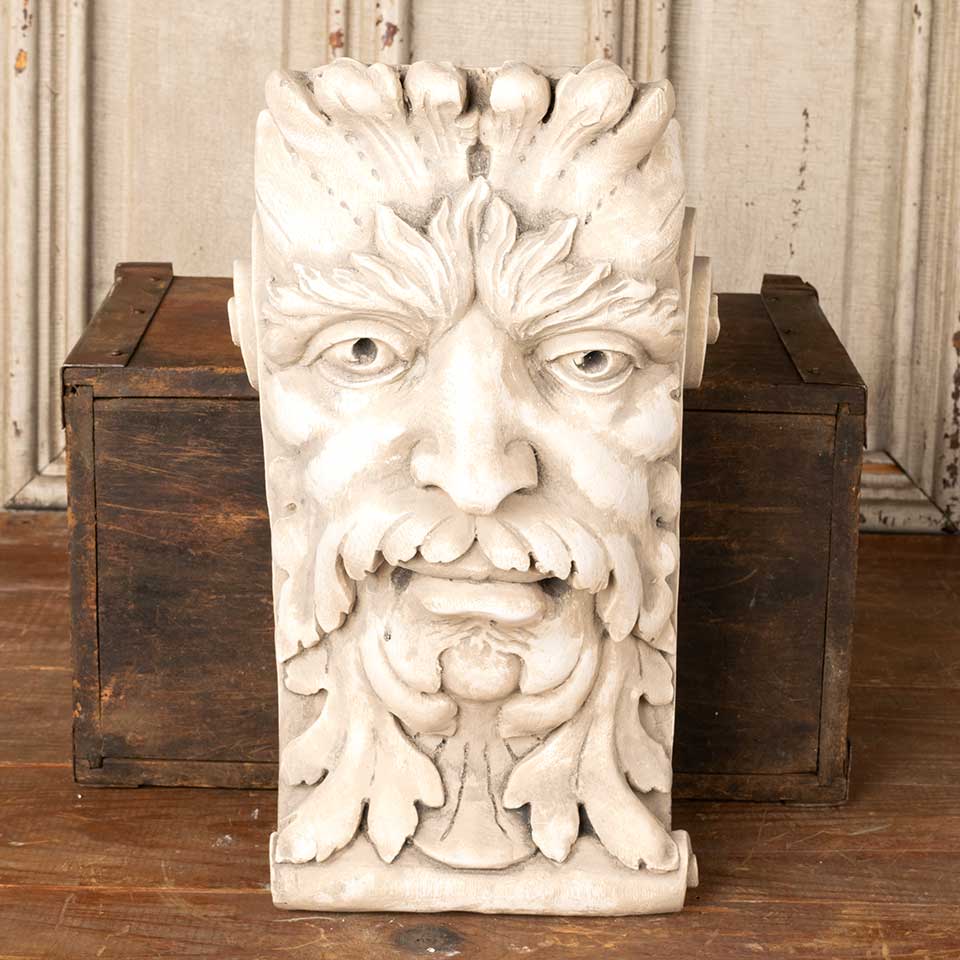 Cast plaster Green Man king's head wall hanging measuring approx. 8 1/4" wide x 11 3/4" tall x 9" front to back. Color and condition may vary.