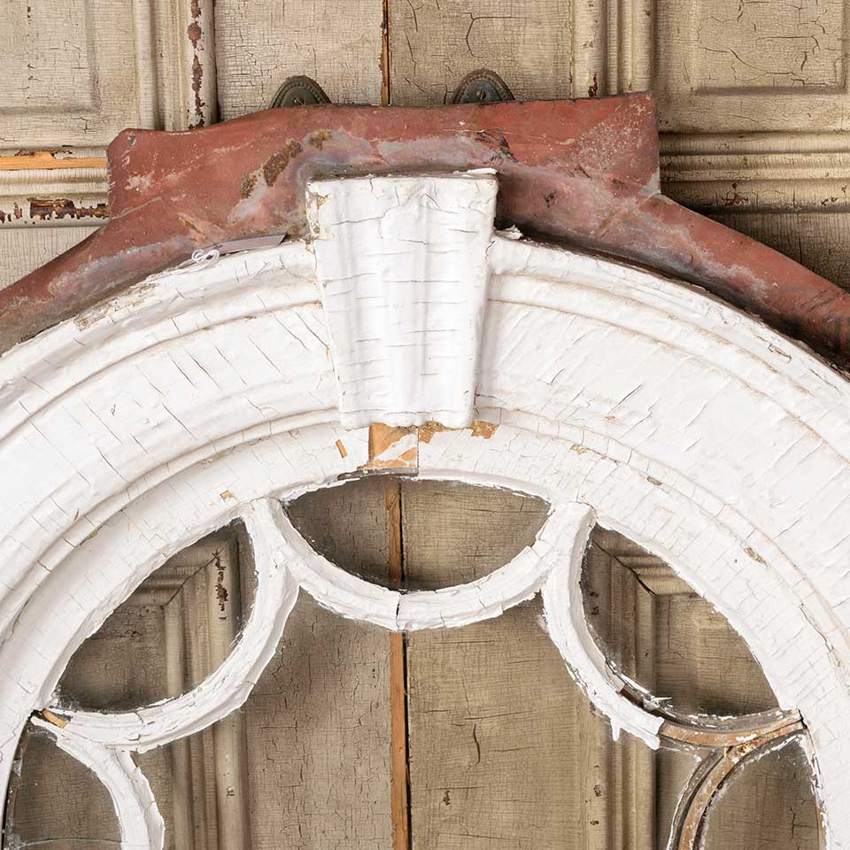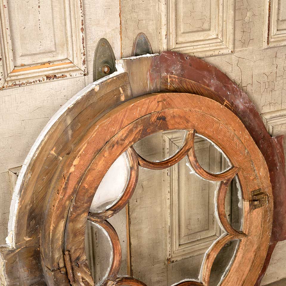 Architectural salvage antique round divided lite operable wood window unit with exterior casing trim measuring approx. 37 1/4" in diameter x 5" front to back (overall dimensions). There's one cracked pane of glass. See photos to evaluate condition.