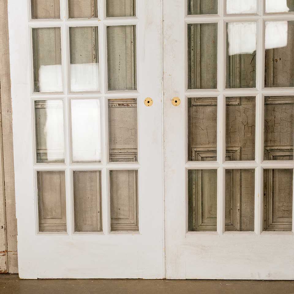 Pair of architectural salvage antique painted wood fifteen lite French doors together measuring approx. 60" wide x 84 1/8" tall x 1 3/8" thick. See photos to evaluate condition. Priced at $1,250 for the pair.