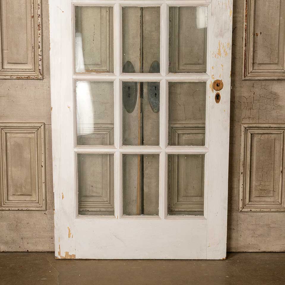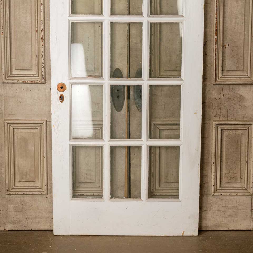Architectural salvage antique painted wood fifteen lite French door with mortise lock measuring approx. 33 3/4" wide x 81" tall x 1 3/8" thick. See photos to evaluate condition.
