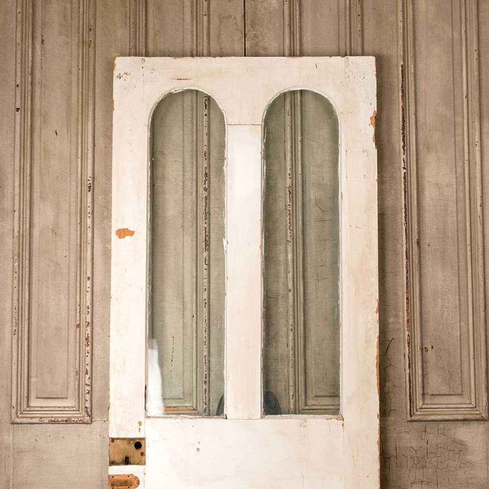 Architectural salvage antique painted wood entry door with two arched top lites with original wavy glass measuring approx. 31 11/16" wide x 79" tall x 1 3/8" thick. One of the panes of glass is cracked. See photos to evaluate condition.