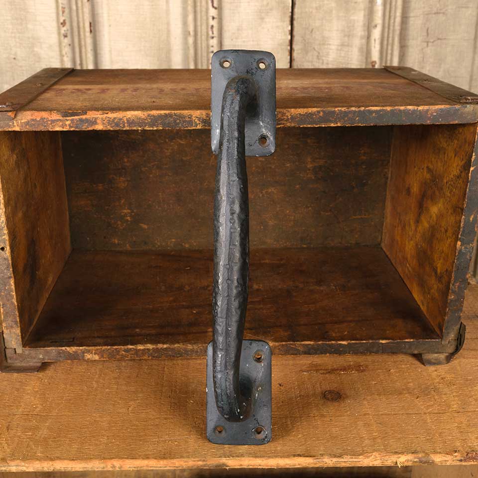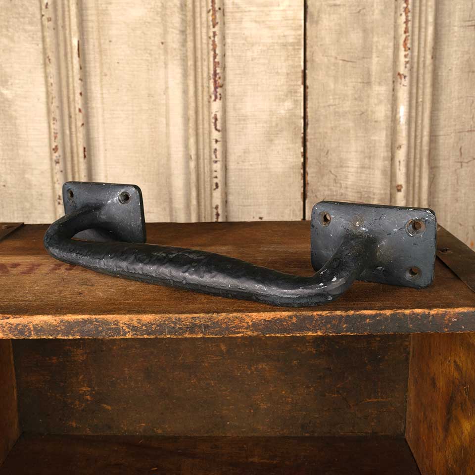 Architectural salvage large cast iron door / furniture pull handle hardware measuring approx. 10 3/8" x 1 3/4" x 2 3/4. Color and condition vary.
