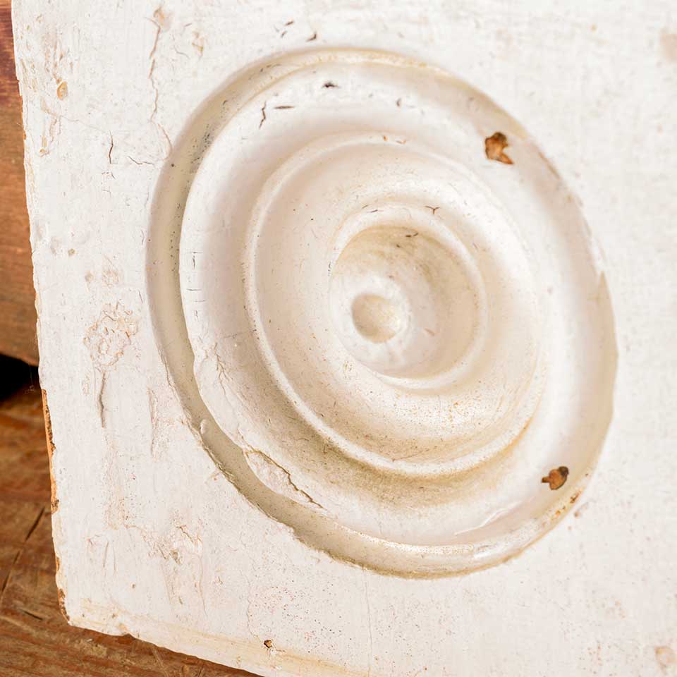 Architectural salvage antique interior window or door painted wood rosette trim block measuring approx. 5 1/2" x 5 1/2" x 1 1/4" front to back. Color and condition vary.