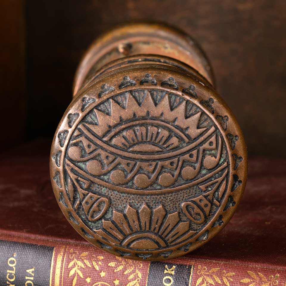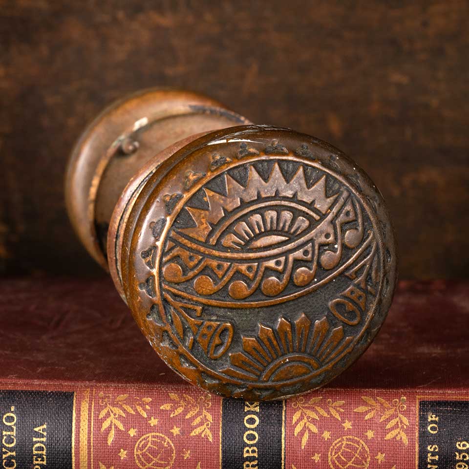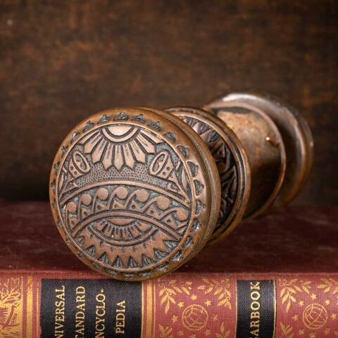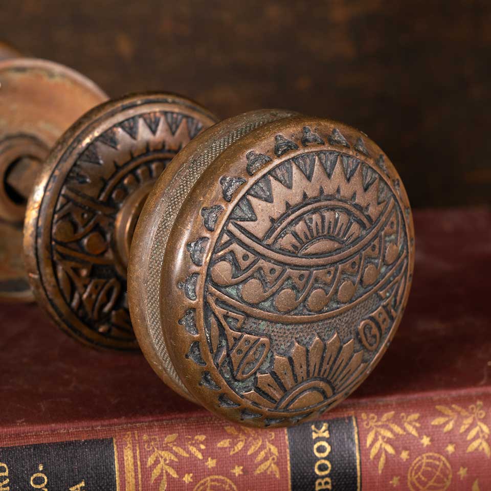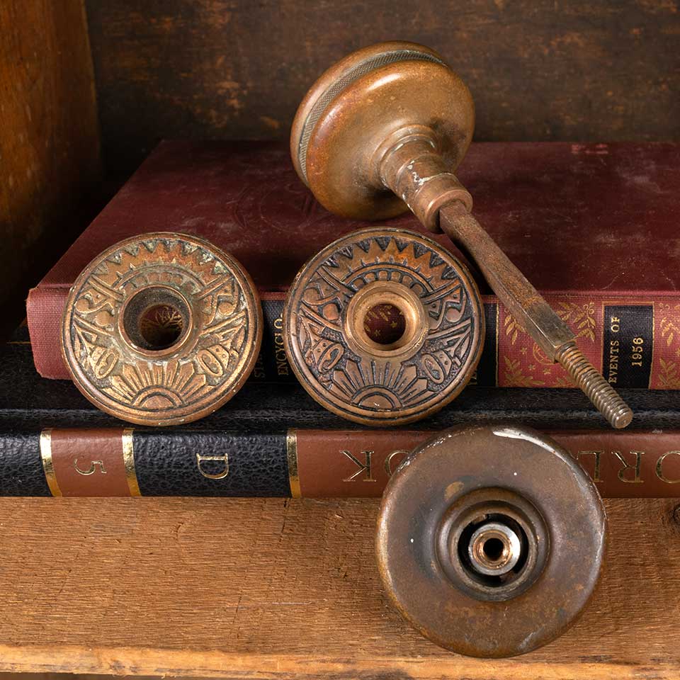 Architectural salvage antique Lock Manufacturing Company Peterborough pattern (circa 1885) ornate Victorian brass door hardware set with Eastlake designs. The set includes two doorknobs (2 1/4" in diameter), two matching doorknob rosette backplates (2 1/8" in diam.), and a tapped spindle with set screws. See photos to evaluate condition. Priced at $275 for the set.