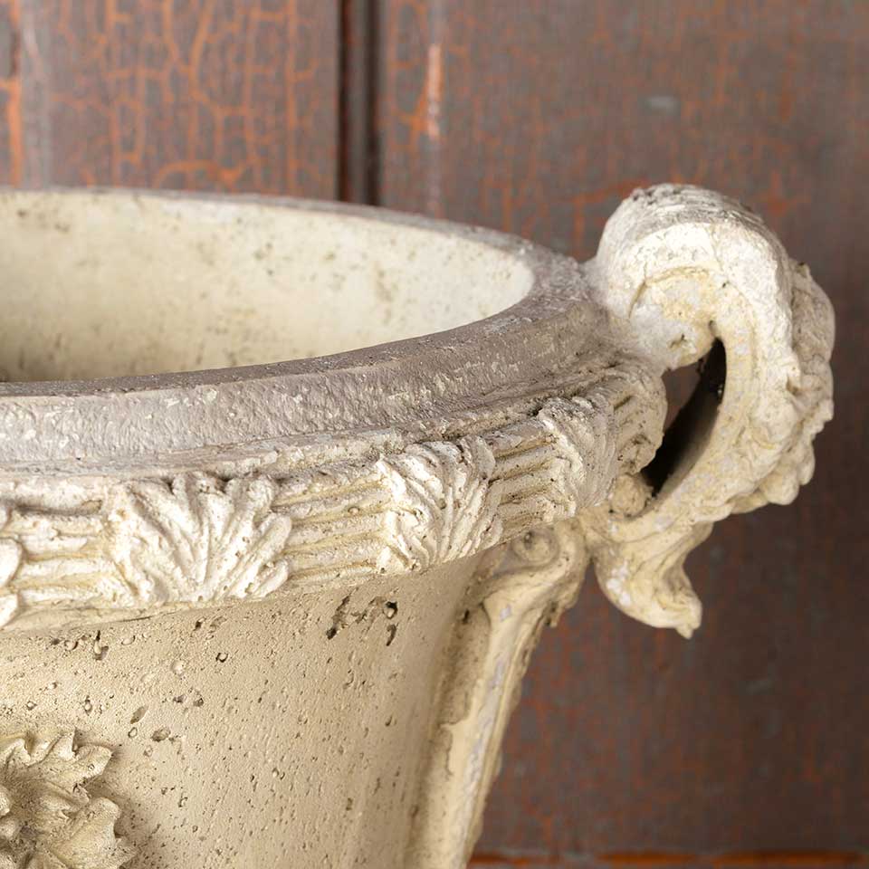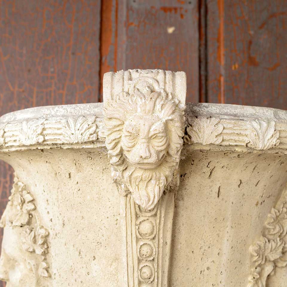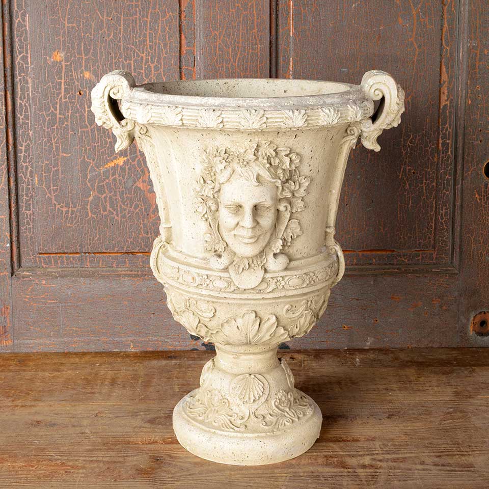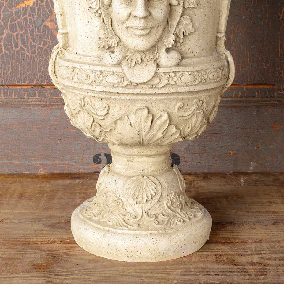 Architectural salvage ornate cast composite garden urn planter measuring approx. 16" wide x 20" tall with a 8 1/2" diameter base. There are a couple of voids. See photos to evaluate condition.