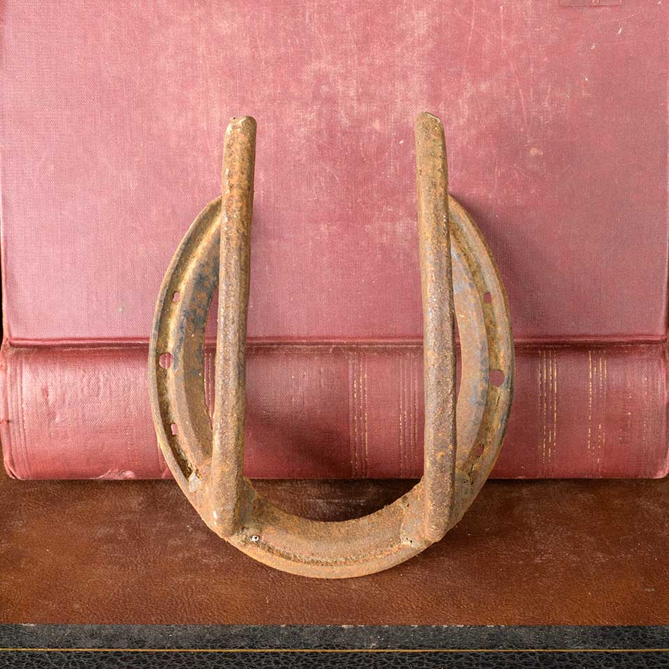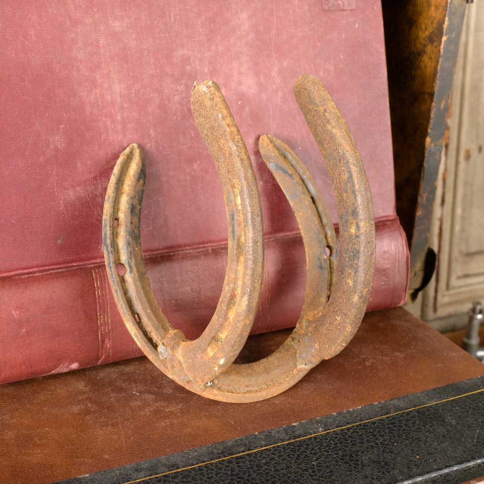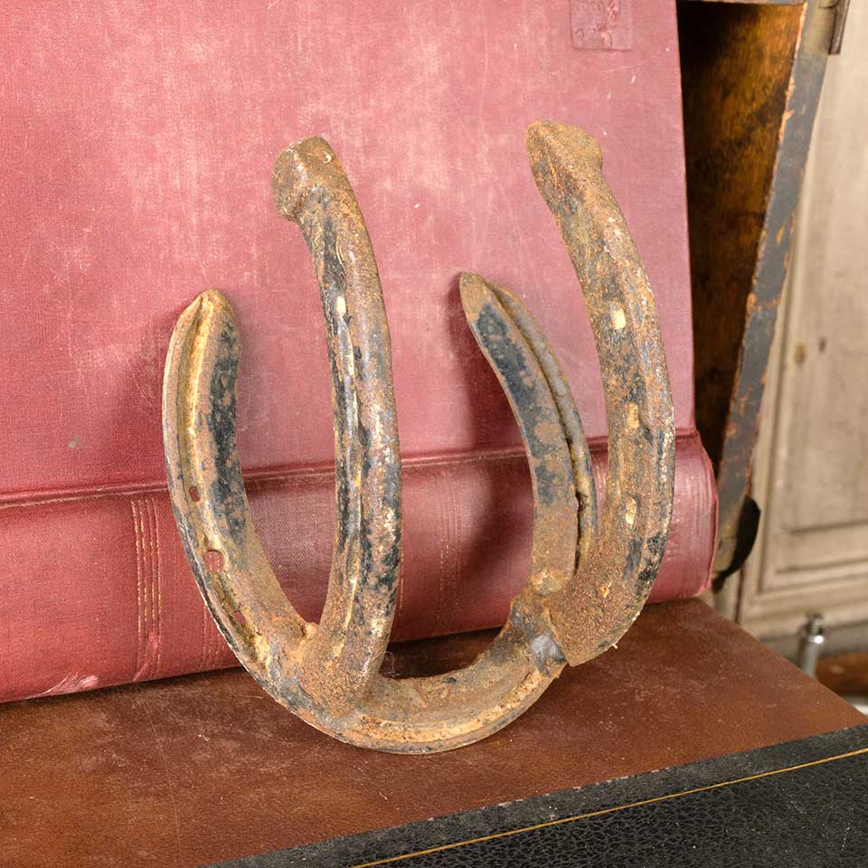 Architectural salvage antique blacksmith horseshoe wall hook measuring approx. 4 5/8" wide x 5" tall x 3" front to back. Size, color and condition vary.