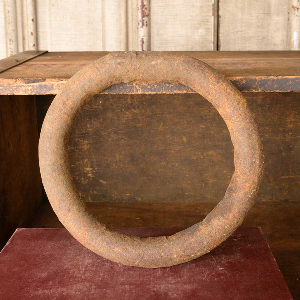 Architectural salvage antique large wrought iron ring measuring approx. 6 1/2" in diameter x 7/8" thick with an interior opening 4 3/4" in diameter. See photos to evaluate condition.