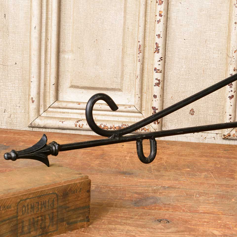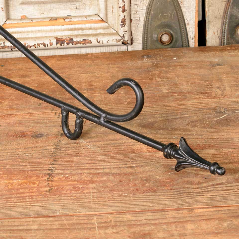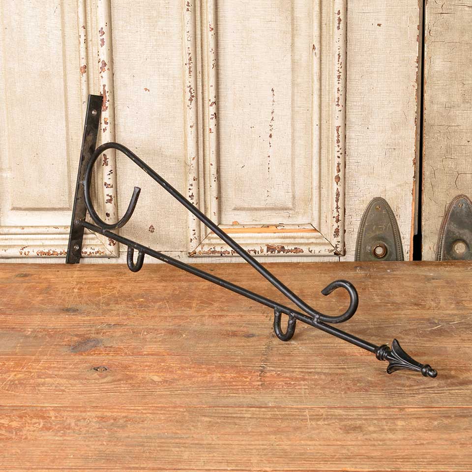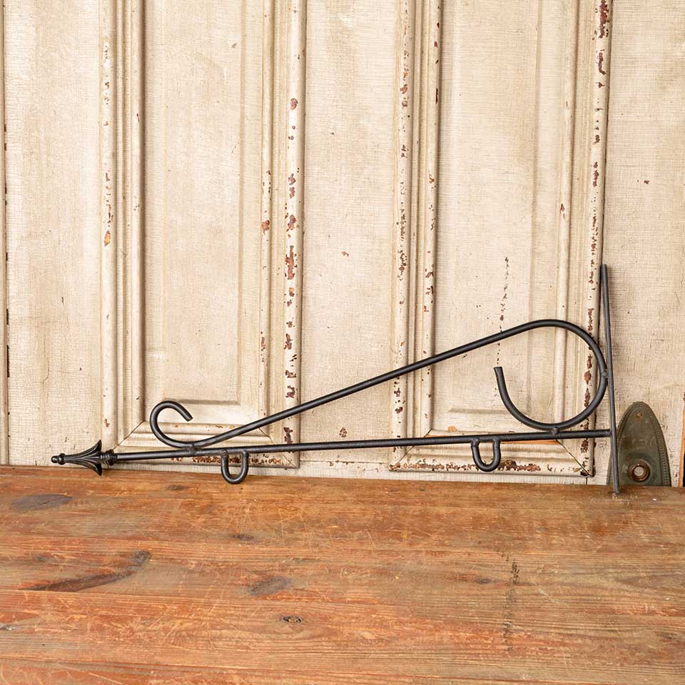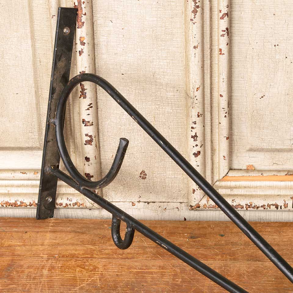 Architectural salvage wrought iron sign bracket measuring approx. 1" wide x 10 1/2" tall x 26 1/2" front to back. Color and condition may vary.