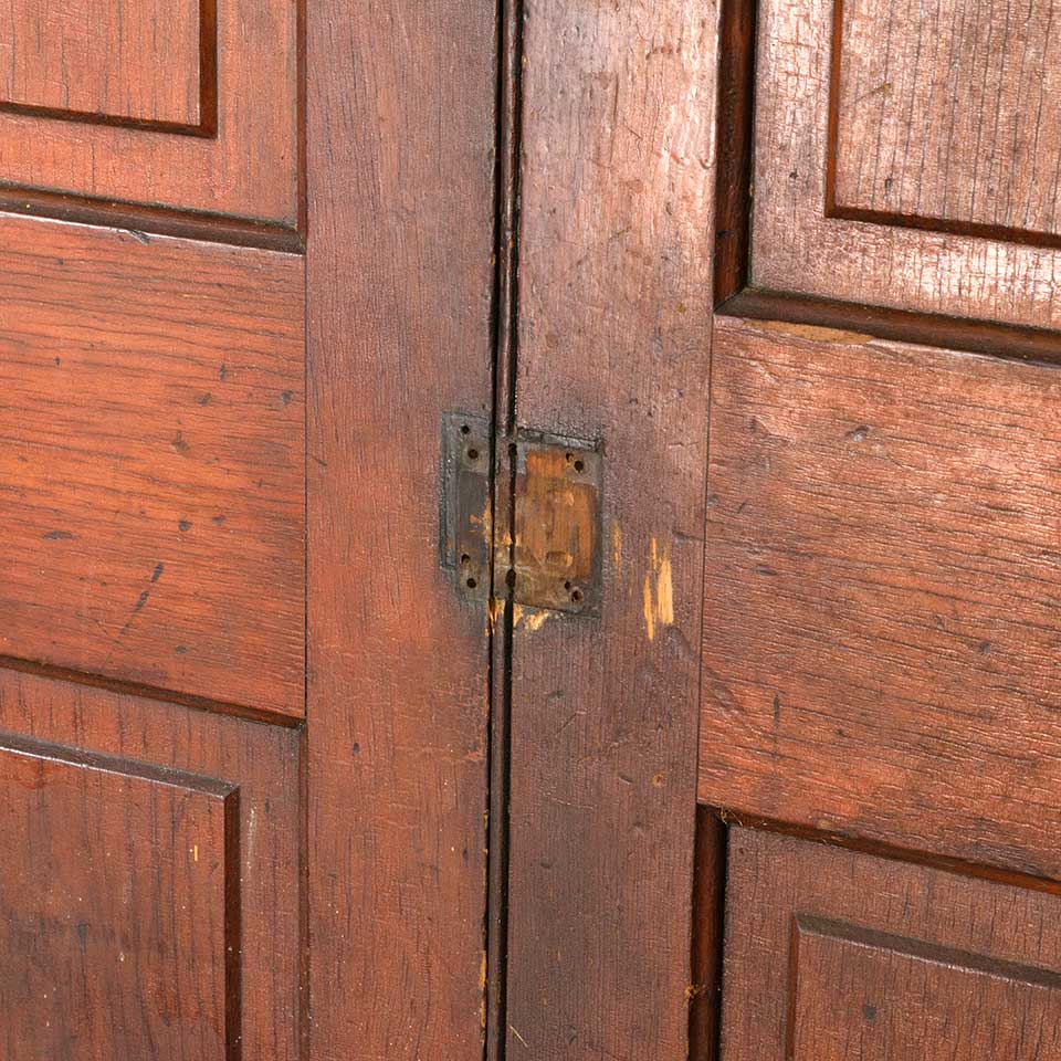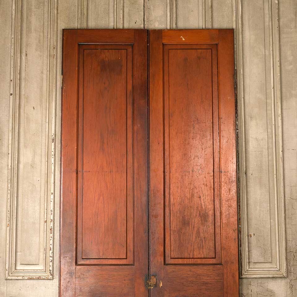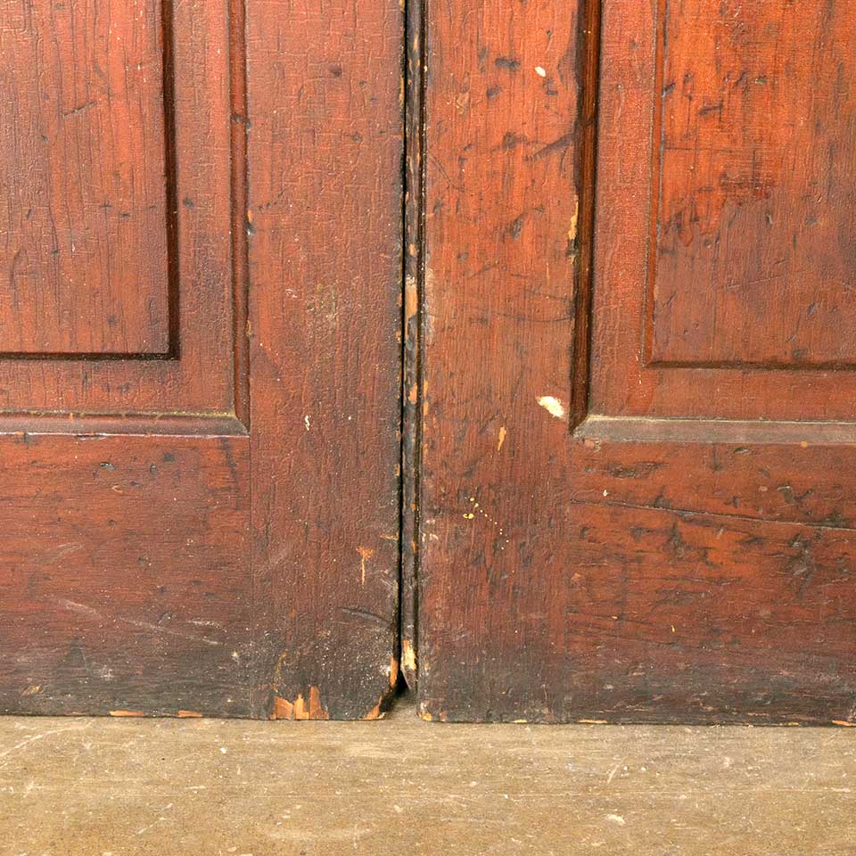 Set of two architectural salvage antique two panel pine wood cabinet doors together measuring approx. 36 1/4" wide x 86 3/4" tall x 1 1/8" thick. See photos to evaluate condition. Priced at $195 for the set of two doors.