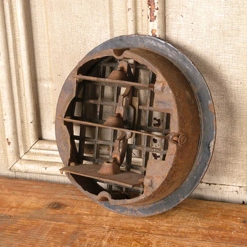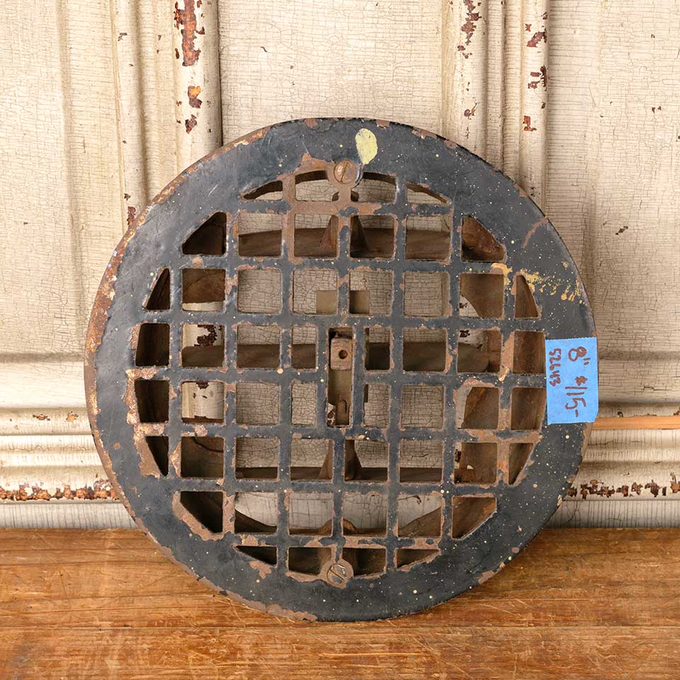 Architectural salvage antique round cast iron heat grate vent cover with operable louvers measuring approx. 8" in diameter (insert dimension) x 9 3/8" in diameter (overall dimension) x 2" front to back. See photos to evaluate condition.