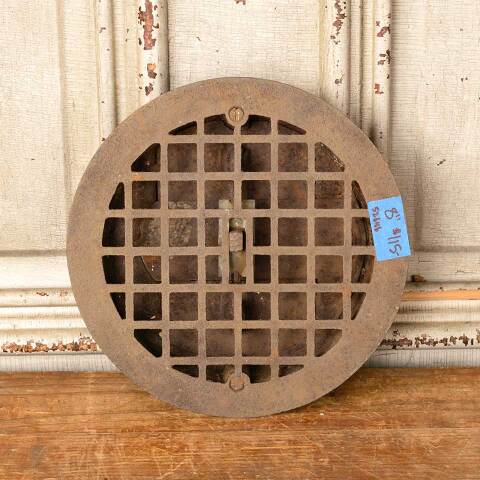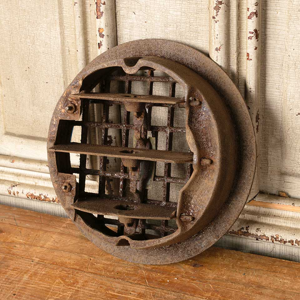 Architectural salvage antique round cast iron heat grate vent cover with operable louvers measuring approx. 8" in diameter (insert dimension) x 9 3/8" in diameter (overall dimension) x 2" front to back. Surface is pitted. See photos to evaluate condition.