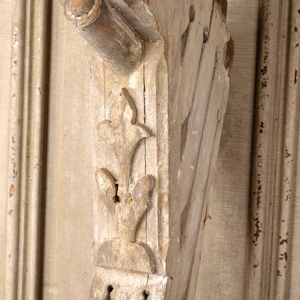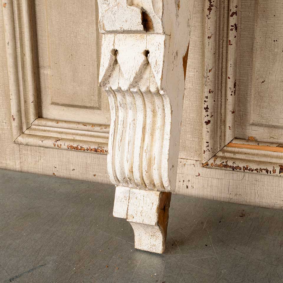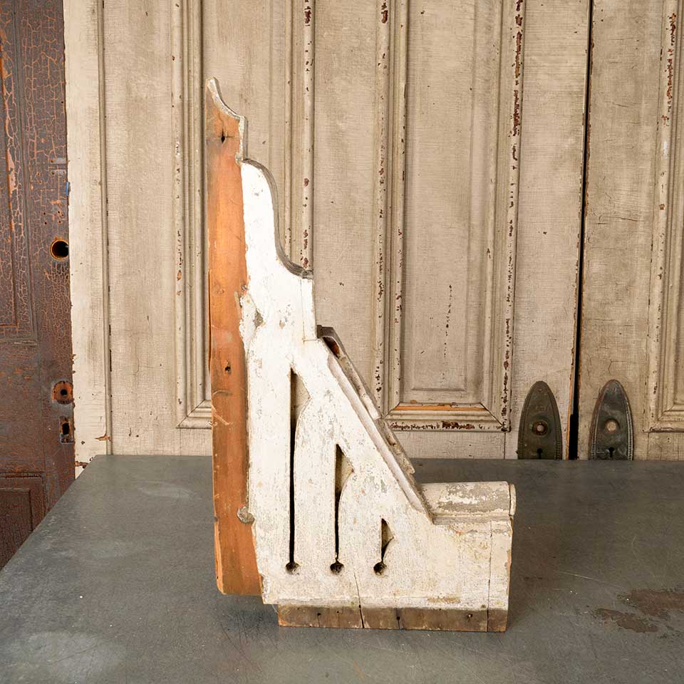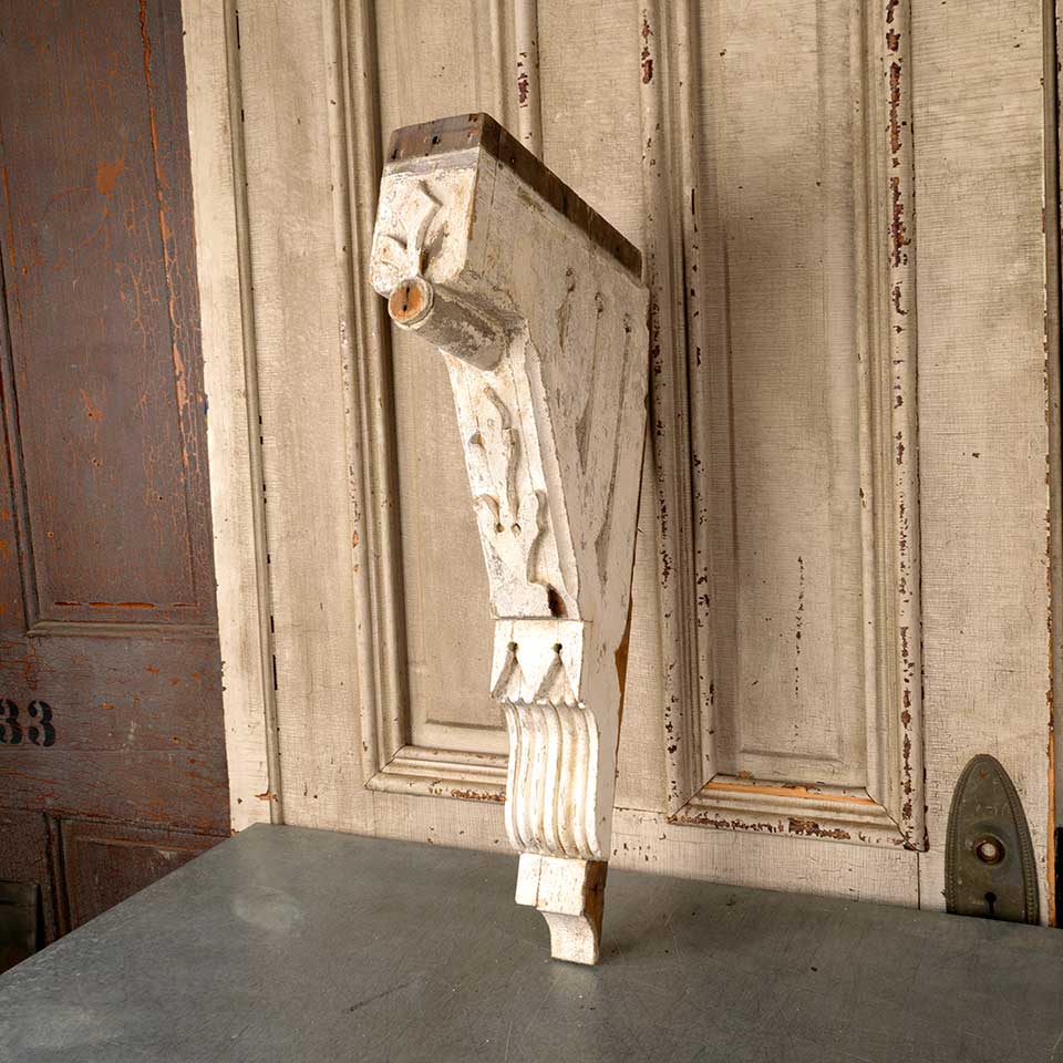 Architectural salvage antique painted wood exterior house corbel bracket measuring approx. 3 1/2" wide x 24" tall x 14" front to back. Color and condition vary.