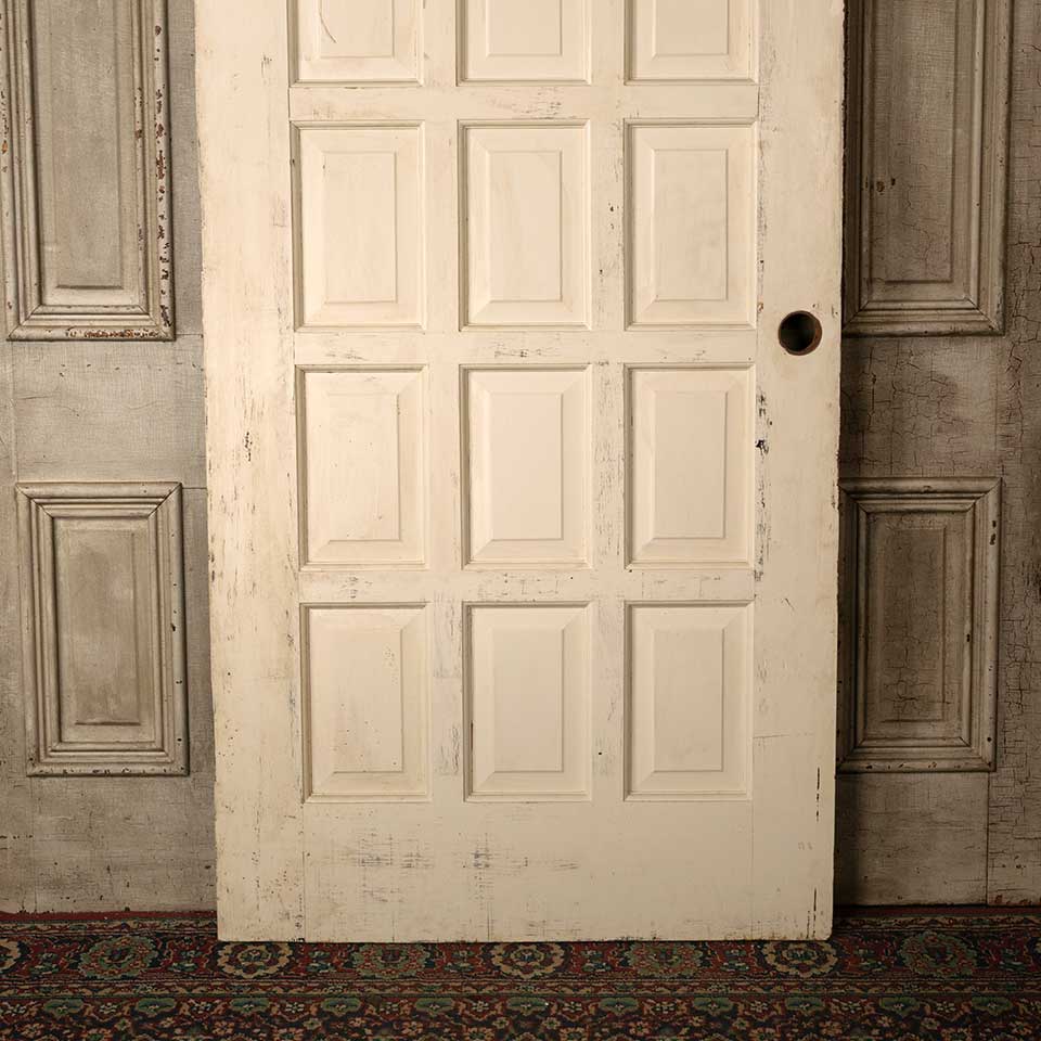 Architectural salvage fifteen panel painted pine wood interior door measuring approx. 35 3/4" wide x 79 1/8" tall x 1 3/4" thick. The wood is split and screwed together at the mortise lock location. See photos to evaluate condition.