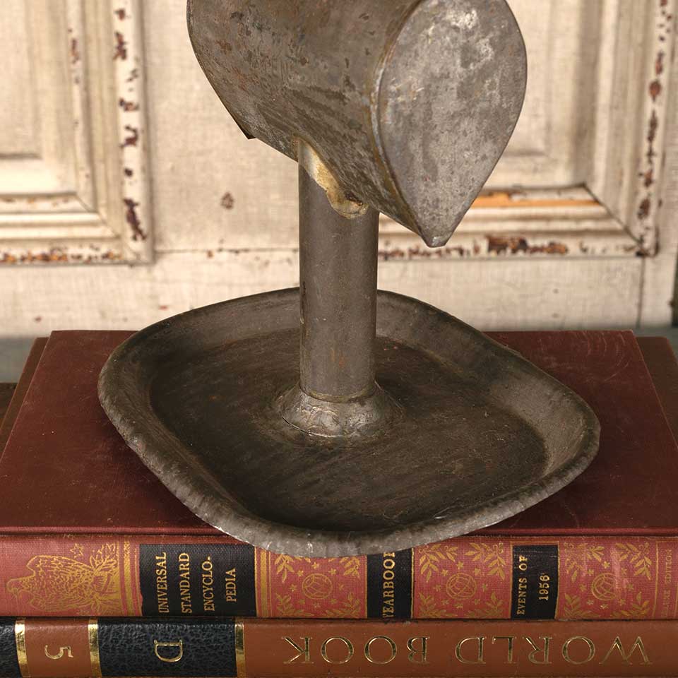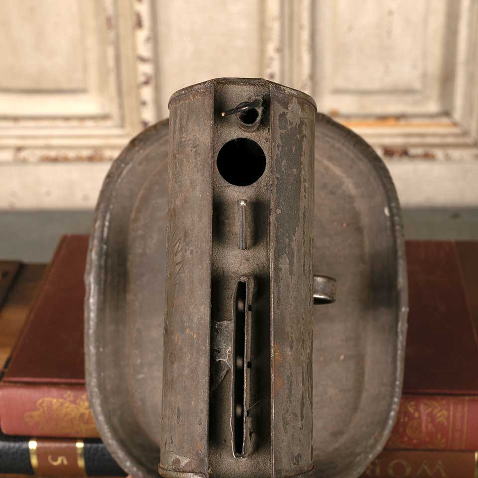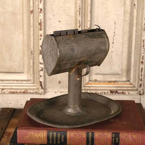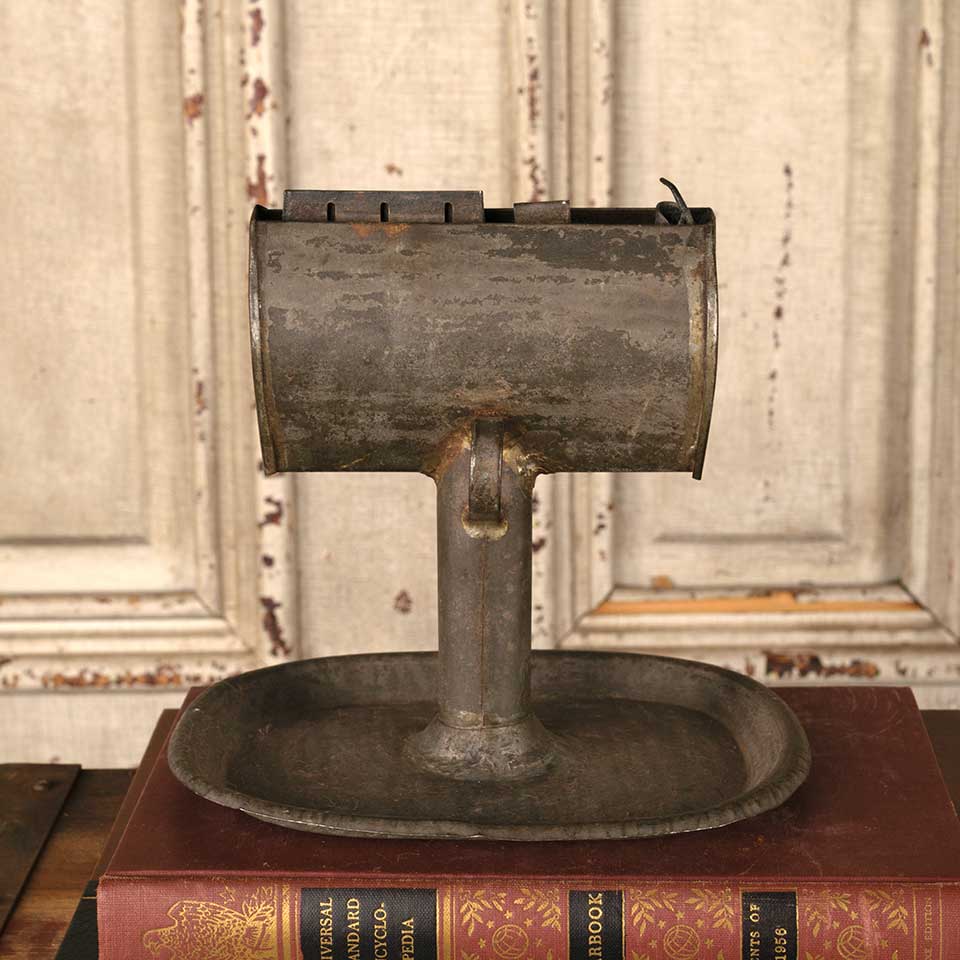 Architectural salvage antique D. Kinnear tin lard lamp with a Patent date of Feb 4 1851 measuring approx. 6 7/8" wide x 6 1/4" tall x 5 1/2" front to back.