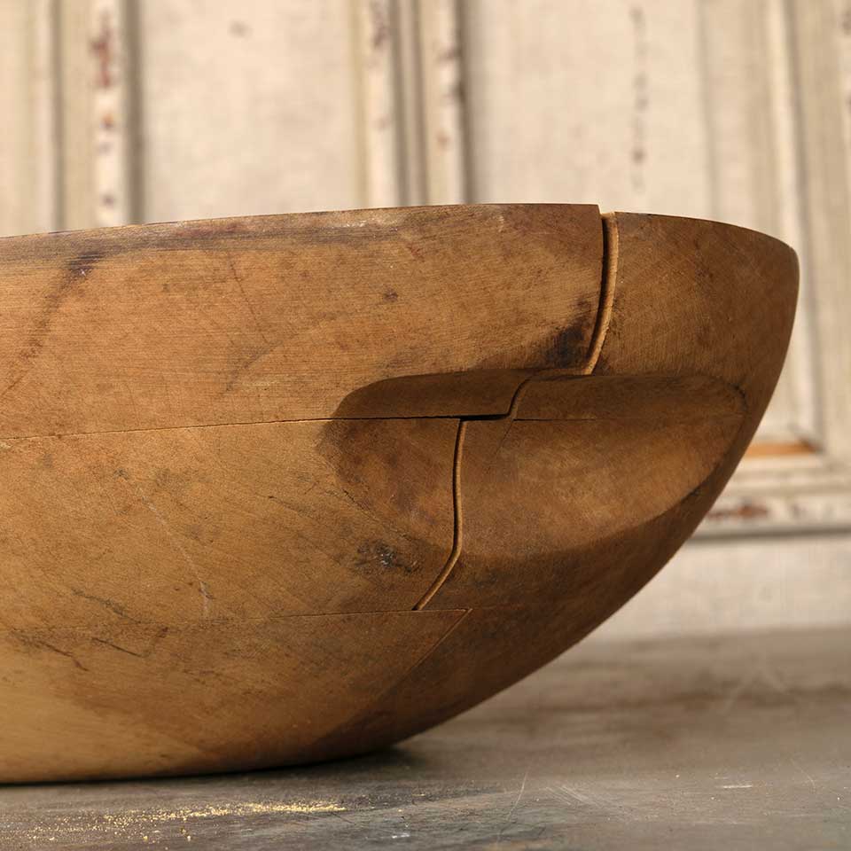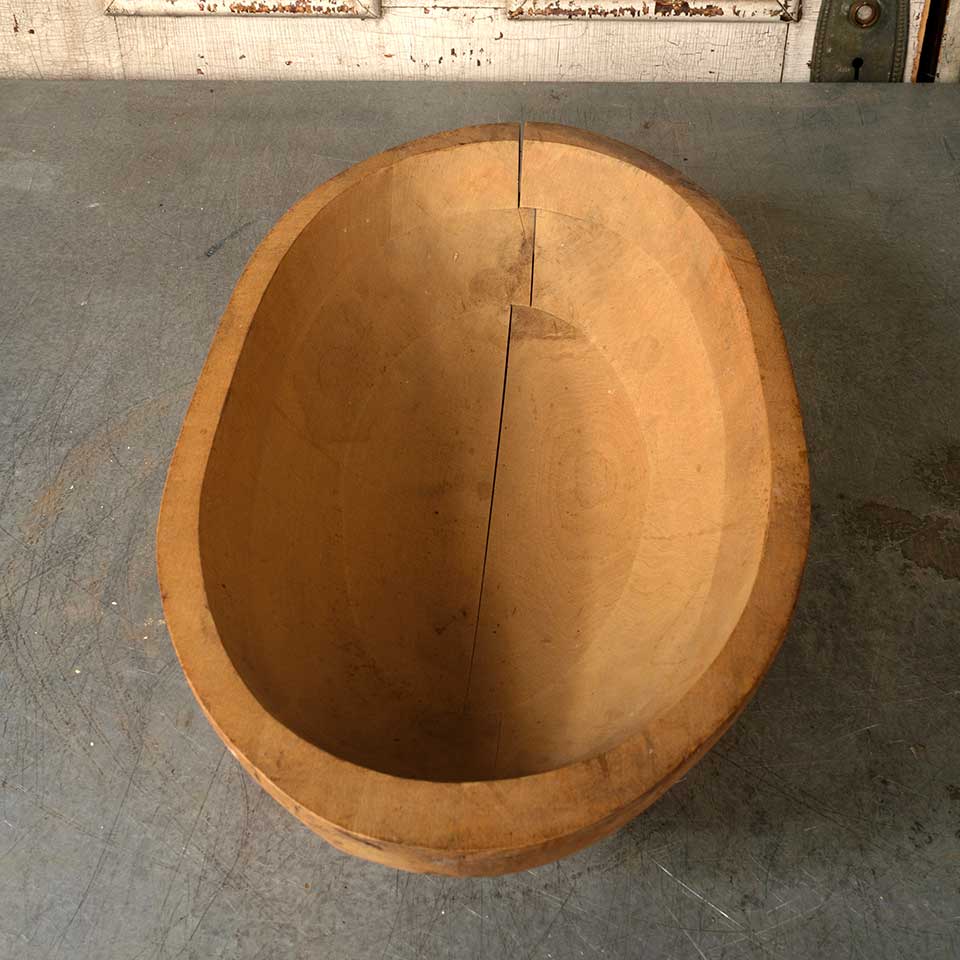 Architectural salvage antique wooden bread dough bowl measuring approx. 20 7/8" wide x 4" tall x 11 1/8" front to back. There is some wood separation in the middle of the bowl, see photos to evaluate.