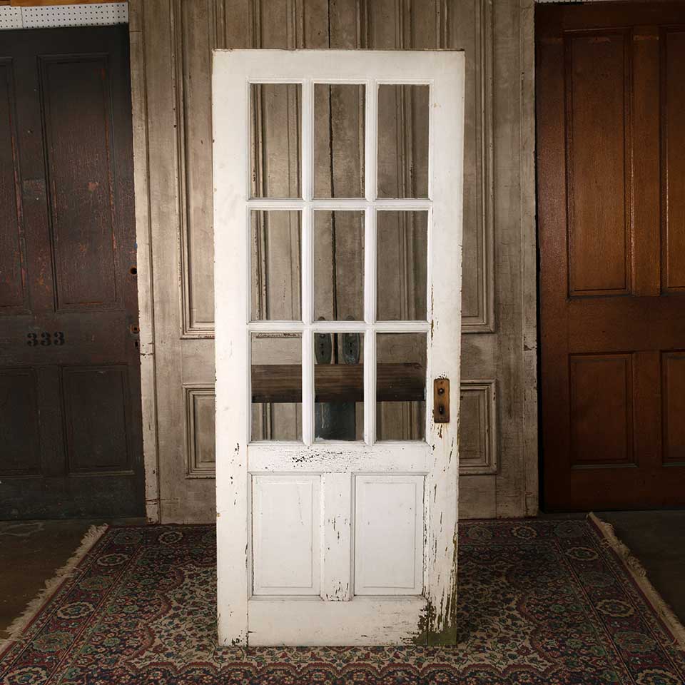 Architectural salvage antique divided nine lite painted wood entry door with mortise lock measuring approx. 31 3/4" wide x 77" tall x 1 3/8" thick. A few of the panes have lines in them that look like cracks but you can only feel them on one side of the glass. A tapered piece of wood has been added to the top of the door. See photos to evaluate condition.
