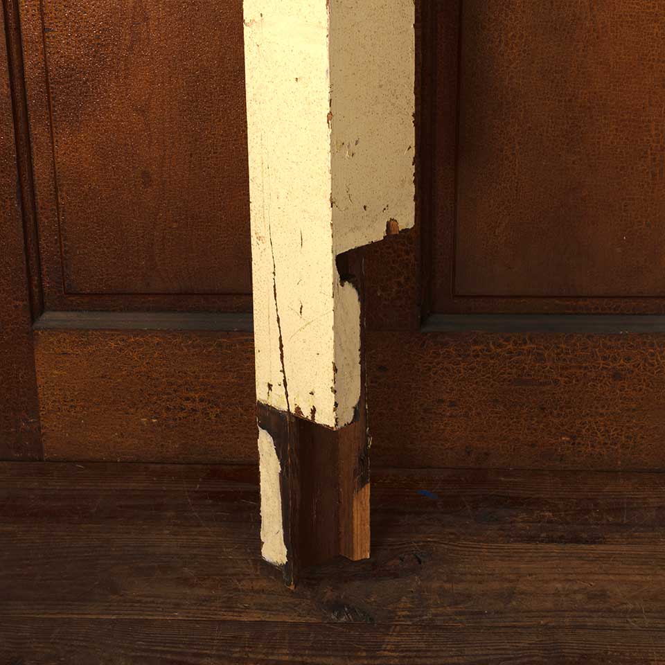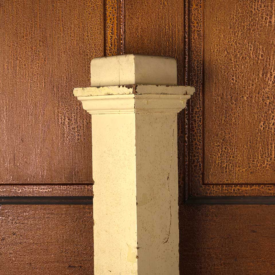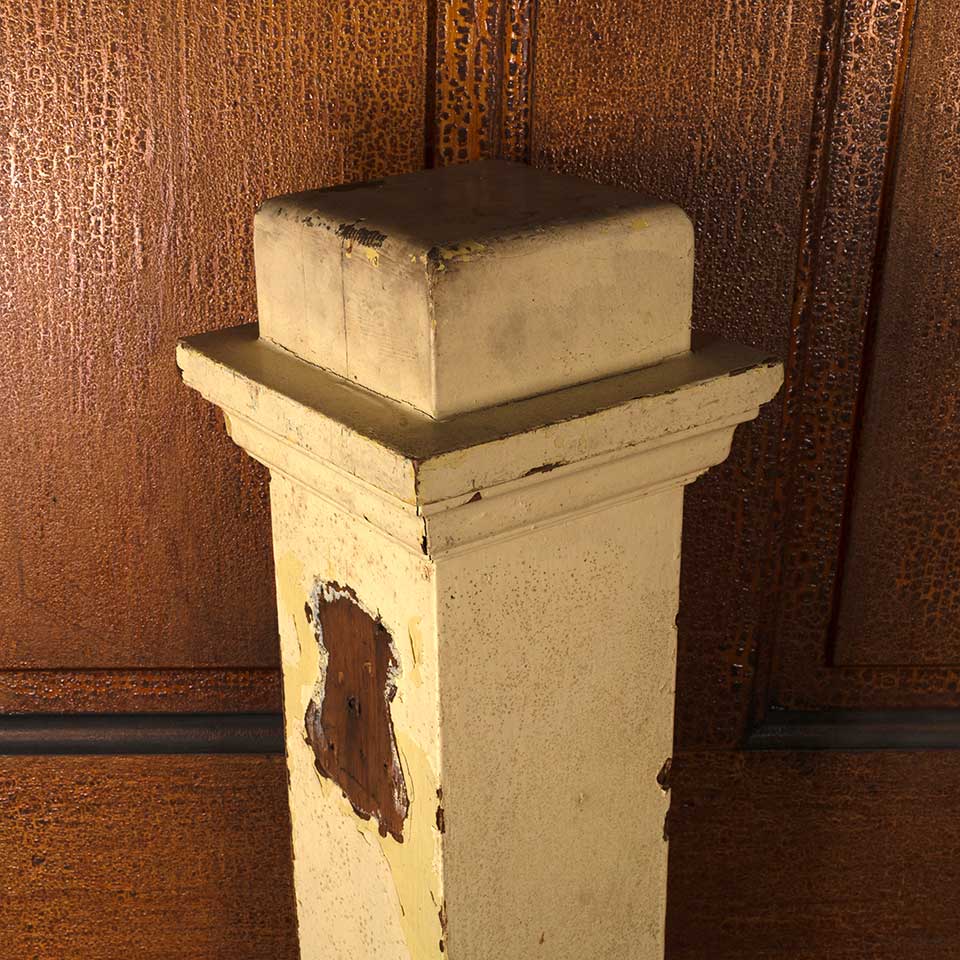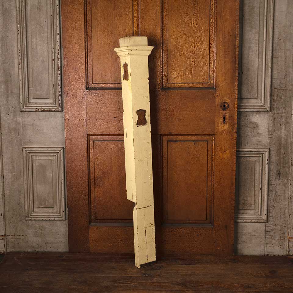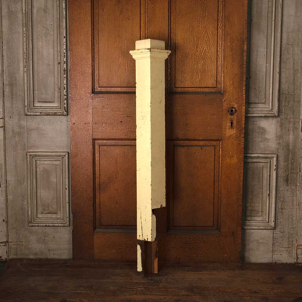 Architectural salvage antique painted oak wood staircase newel post measuring approx. 4 1/2" x 4 1/2" x 50 1/4" tall with a 6 1/4" x 6 1/4" top. The bottom 14 1/2" are notched out. See photos to evaluate condition.